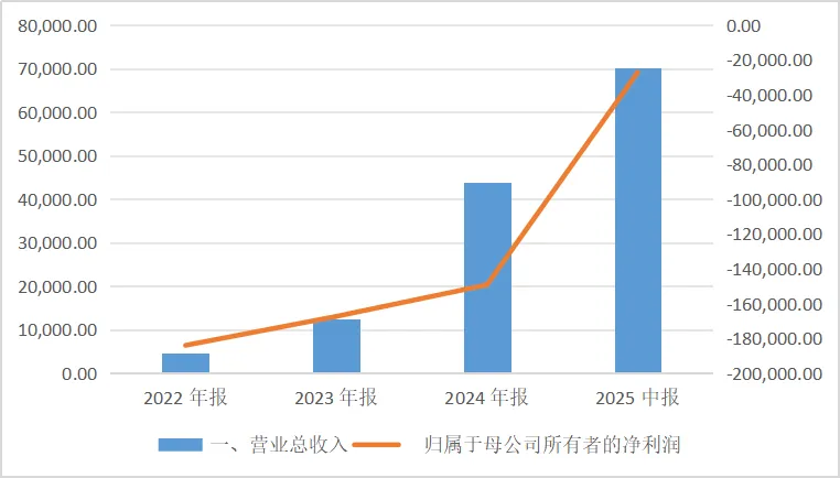 2025年上半年,摩尔线程实现营业收入7.02亿元,同比增长155.53%,这一数字不仅超过了2024年全年4.38亿元的营收,更超过了2022-2024三年总和(约6.08亿元)。