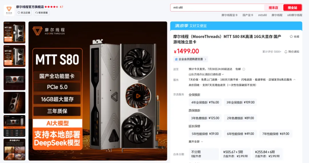 制裁之后摩尔线程没有再继续出游戏显卡,彻底转向数据中心算力卡方向。其官网上的S70和S80,大概率是一直没卖完的库存。16G显存的S80,已经降价到1499元。