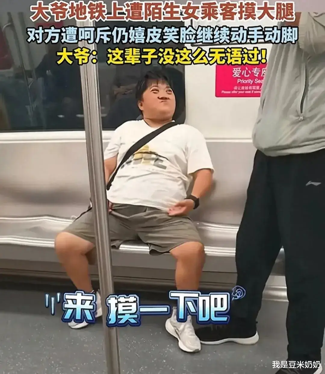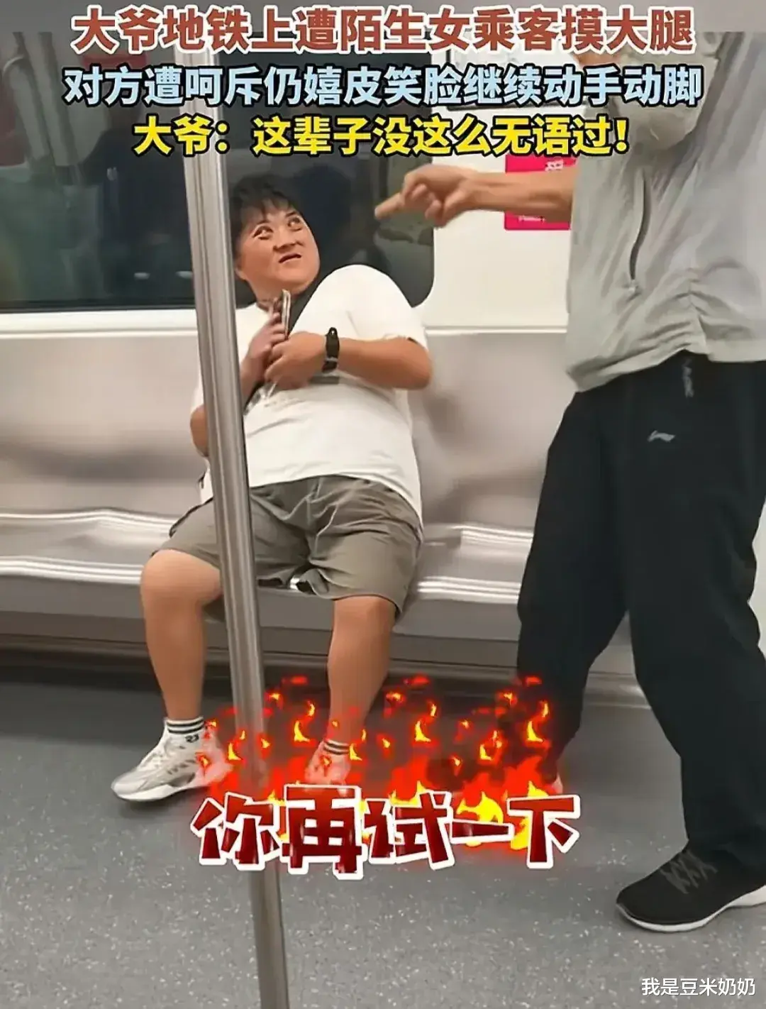 这一触碰让大爷全身一激灵,立刻从座位上跳了起来,惊讶之余,他质问女子“你要干什么”。