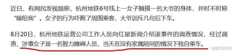 8月20日,杭州地铁运营公司对事件进行了调查,证实这名女子确实是一位智力障碍人士。