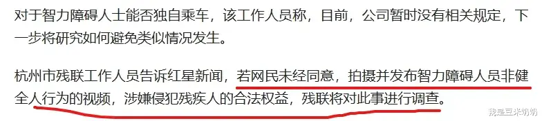 对此,杭州市残联工作人员表示,如果网友未经当事人或其家属同意,拍摄并发布智力障碍人士的行为视频,可能涉嫌侵犯残疾人的合法权益。