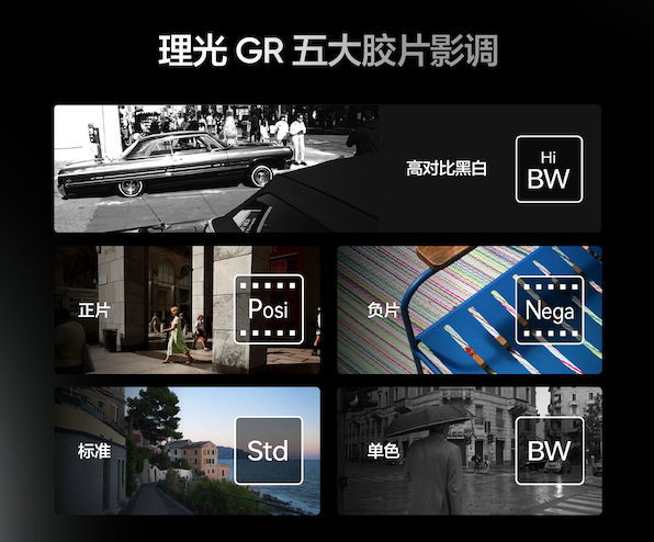 色彩党也别错过!手机里藏了理光 GR 近 30 年的胶片精髓:标准、正片、负片、单色、高对比黑白五种经典影调,都是经数百种光线测试调出来的,还能自己改参数玩出专属风格。机身上的 RICOH GR 丝印、专属相册和水印,仪式感直接拉满。