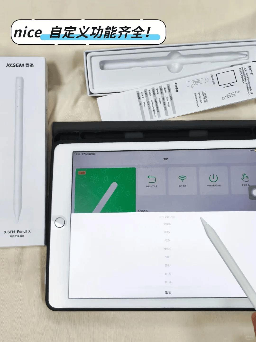 与此同时,进阶的1.5mm POM高分子笔尖拥有高耐磨损、低摩擦特质,不仅能够有效维护屏幕,还能平稳传递笔迹,带来流畅且具控制感的书写感受。并且西圣Pencil X全新进阶了百万级高阶感应架构,内置精确的倾斜角度感应器,能精确辨识笔身的倾斜变化;全屏防误触技术也获得全面改善,使用时手掌可自然贴合屏幕,不必悬空手腕,真实重现纸笔般的书写手感,确保书写时不受误触干扰,帮助用户专注创作,轻松完成各类书写和绘画任务。此外,西圣PencilX电容笔搭载有全新50段信号调校技术和24项自定义快捷功能,能够根据不同设备屏幕特性智能匹配最优信号强度,还能实现“一支笔搞定多场景操作”的创新体验,支持单击、双击、长按等手势,高效完成切换工具、截屏、撤销等操作,使书写绘画更流畅。