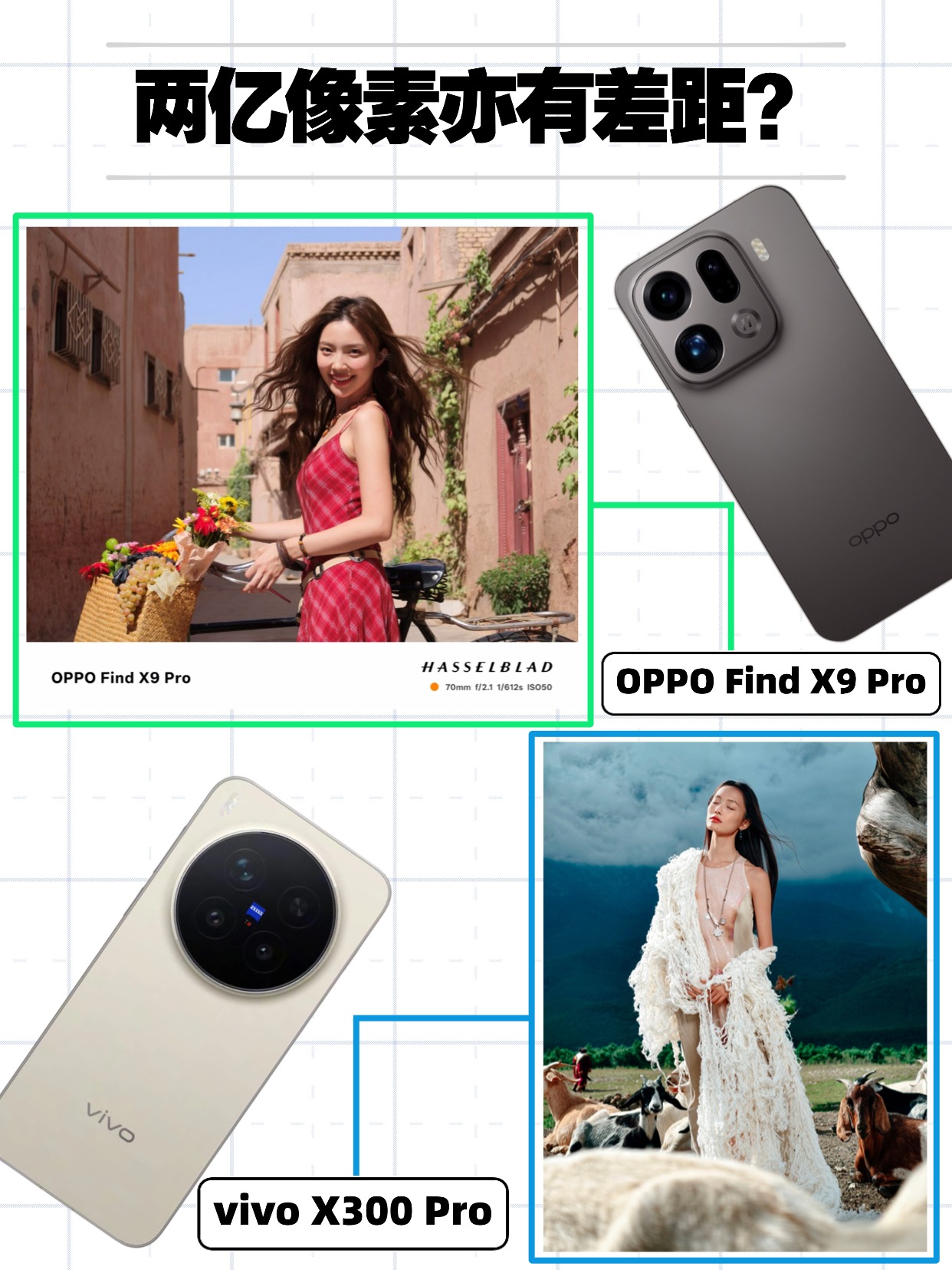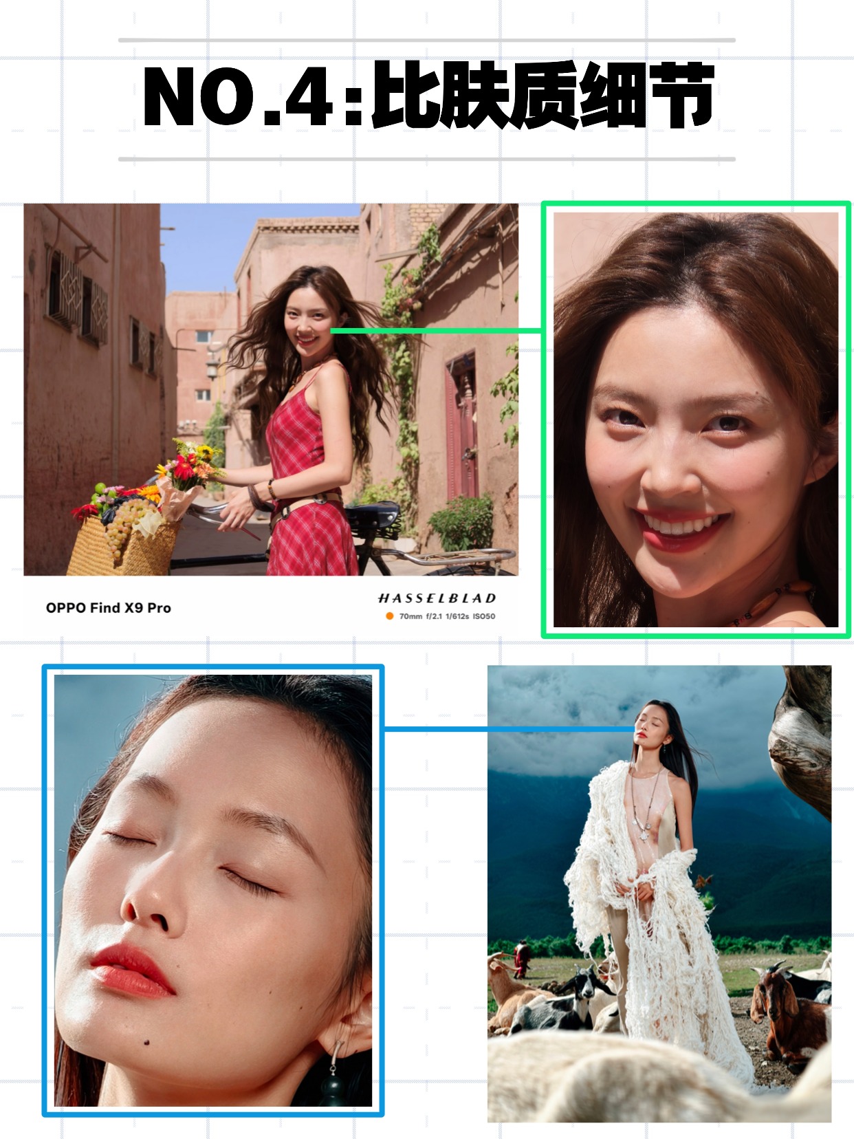 回归模特主体,在服饰细节呈现上OPPO Find X9 Pro依旧要做的更好,方格交汇、分布清晰可见,vivo X300 Pro则有明显的涂抹感;聚焦模特面部,光影与五官呈现方面两家都表现不错,放大后该有的面部细节都有,个人比较喜欢OPPO这张,气血感更足。