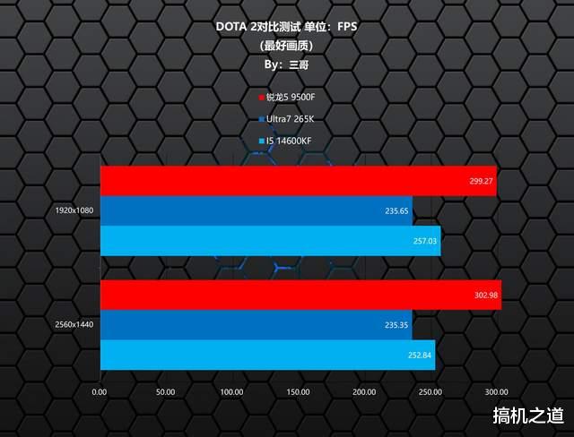 在《DOTA 2》测试中,锐龙5 9500F相较Ultra7 265K,在两个分辨率下均有大幅度的领先,其中1080P分辨率下领先了63.62帧,领先比率27.00%;1440P分辨率下领先了67.63帧,领先比率28.74%。锐龙5 9500F相较I5 14600KF,在两个分辨率下也有大幅度的领先,其中1080P分辨率下领先了42.24帧,领先比率16.43%;1440P分辨率下领先了50.14帧,领先比率19.83%。