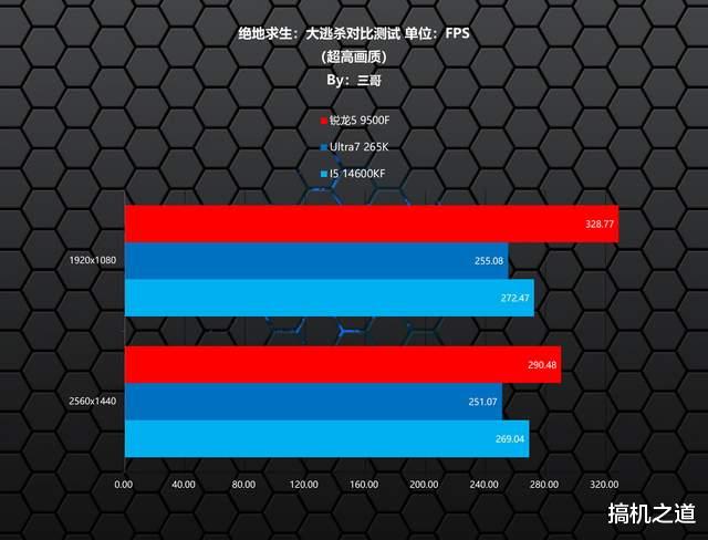 在《绝地求生:大逃杀》测试中,锐龙5 9500F相较Ultra7 265K,在两个分辨率下均有大幅度的领先,其中1080P分辨率下领先了73.69帧,领先比率28.89%;1440P分辨率下领先了39.41帧,领先比率15.70%。锐龙5 9500F相较I5 14600KF,在两个分辨率下也有大幅度的领先,其中1080P分辨率下领先了56.30帧,领先比率20.66%;1440P分辨率下领先了21.44帧,领先比率7.97%。