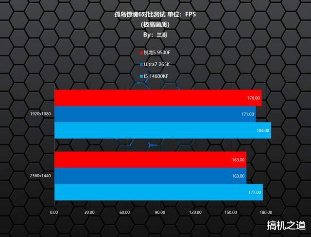 在《孤岛惊魂6》测试中,锐龙5 9500F相较Ultra7 265K,在两个分辨率下均有不同程度的领先,其中1080P分辨率下领先了5.00帧,领先比率2.92%;1440P分辨率下二者持平。锐龙5 9500F相较I5 14600KF,在两个分辨率下均有较为明显的落后,其中1080P分辨率下落后了8.00帧,落后比率4.35%;1440P分辨率下落后了14.00帧,落后比率7.91%。