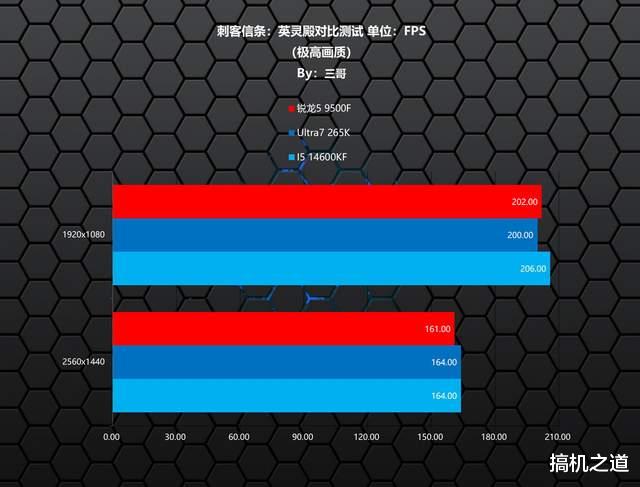 在《刺客信条:英灵殿》测试中,锐龙5 9500F相较Ultra7 265K,在两个分辨率下互有胜负,其中1080P分辨率下领先了2.00帧,领先比率1.00%;1440P分辨率下落后了3.00帧,落后比率1.83%。锐龙5 9500F相较I5 14600KF,在两个分辨率下均有小幅度的落后,其中1080P分辨率下落后了4.00帧,落后比率1.94%;1440P分辨率下落后了3.00帧,落后比率1.83%。