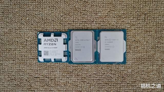 三位测试选手登场,其中左侧为AMD 锐龙5 9500F,中间为Intel Ultra7 265K,右侧为Intel I5 14600KF。