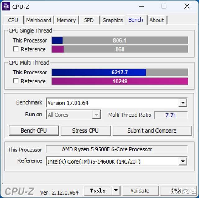 理论性能测试,CPU-Z基准测试,由于锐龙5 9500F是锐龙5 9600X略微降规格而来,故而两者的理论性能也非常接近。