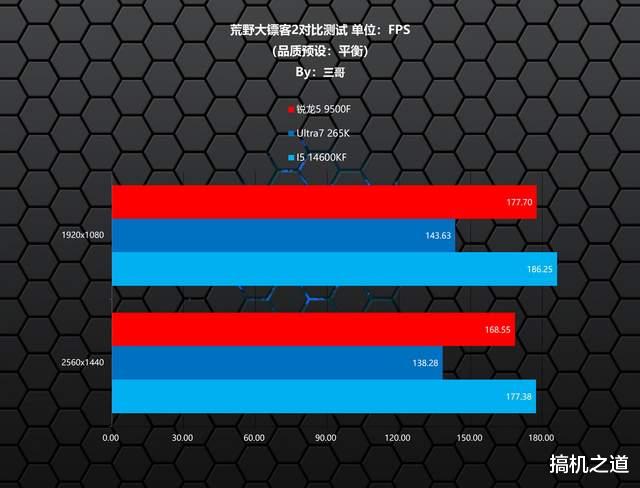 在《荒野大镖客2》测试中,锐龙5 9500F相较Ultra7 265K,在两个分辨率下均有大幅度的领先,其中1080P分辨率下领先了34.07帧,领先比率23.72%;1440P分辨率下领先了30.27帧,领先比率21.89%。锐龙5 9500F相较I5 14600KF,在两个分辨率下均有小幅度的落后,其中1080P分辨率下落后了8.55帧,落后比率4.59%;1440P分辨率下落后了8.83帧,落后比率4.98%。