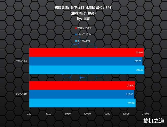 在《极限竞速:地平线5》测试中,锐龙5 9500F相较Ultra7 265K,在两个分辨率下均有小幅度的领先,其中1080P分辨率下领先了3.00帧,领先比率1.29%;1440P分辨率下领先了2.00帧,领先比率0.93%。锐龙5 9500F相较I5 14600KF,在两个分辨率下均有小幅度的落后,其中1080P分辨率下落后了1.00帧;1440P分辨率下落后了1.00帧。