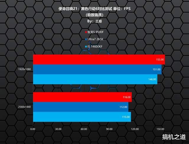 在《使命召唤21:黑色行动6》测试中,锐龙5 9500F相较Ultra7 265K,在两个分辨率下均有不同程度的领先,其中1080P分辨率下领先了4.00帧,领先比率2.65%;1440P分辨率下领先了4.00帧,领先比率3.57%。锐龙5 9500F相较I5 14600KF,在两个分辨率下也有不同程度的领先,其中1080P分辨率下领先了9.00帧,领先比率6.16%;1440P分辨率下领先了1.00帧,领先比率0.87%。