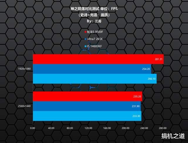 在《神之陨落》测试中,锐龙5 9500F相较Ultra7 265K,在两个分辨率下均有较为明显的领先,其中1080P分辨率下领先了27.11帧,领先比率10.66%;1440P分辨率下领先了3.30帧,领先比率1.42%。锐龙5 9500F相较I5 14600KF,在两个分辨率下也有不同程度的领先,其中1080P分辨率下领先了15.21帧,领先比率5.72%;1440P分辨率下领先了1.90帧,领先比率0.81%。