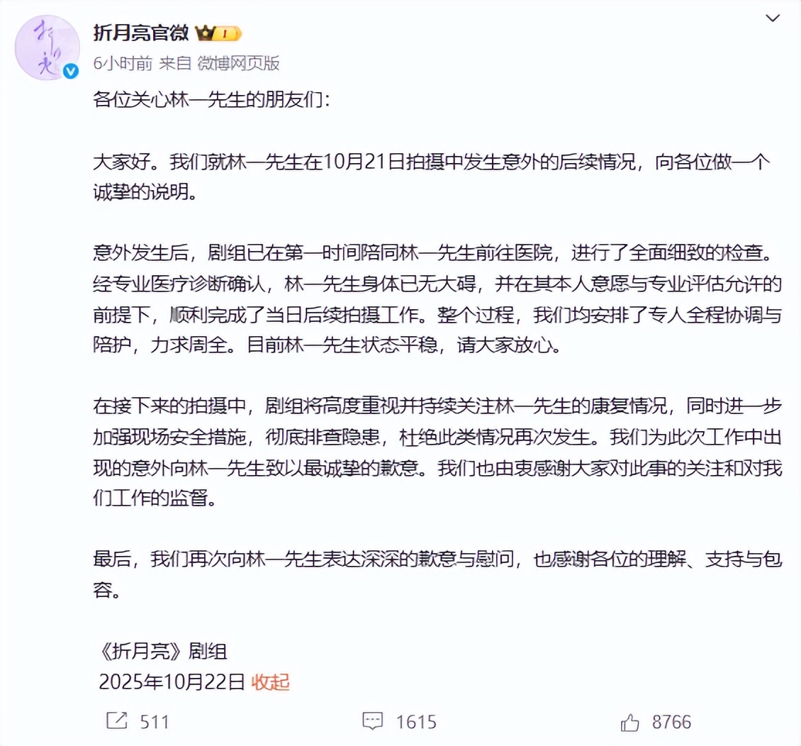 各位关心林一先生的朋友们:大家好。我们就林一先生在10月21日拍摄中发生意外的后续情况,向各位做一个诚挚的说明。意外发生后,剧组已在第一时间陪同林一先生前往医院,进行了全面细致的检查。经专业医疗诊断确认,林一先生身体已无大碍,并在其本人意愿与专业评估允许的前提下,顺利完成了当日后续拍摄工作。整个过程,我们均安排了专人全程协调与陪护,力求周全。