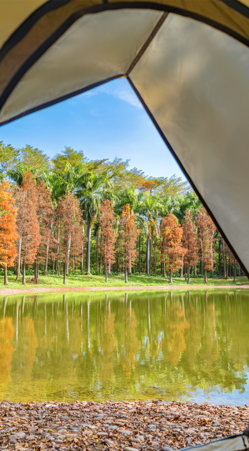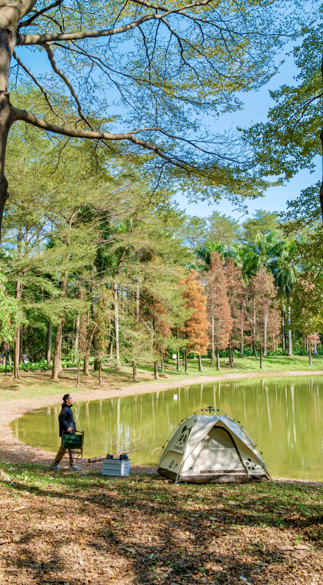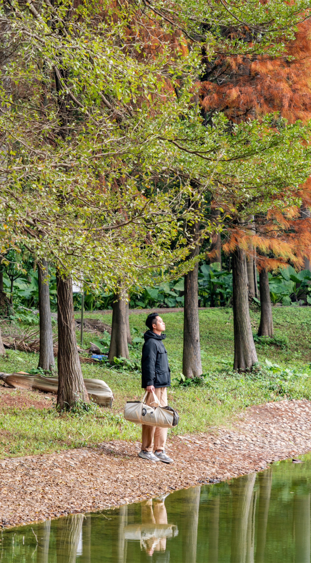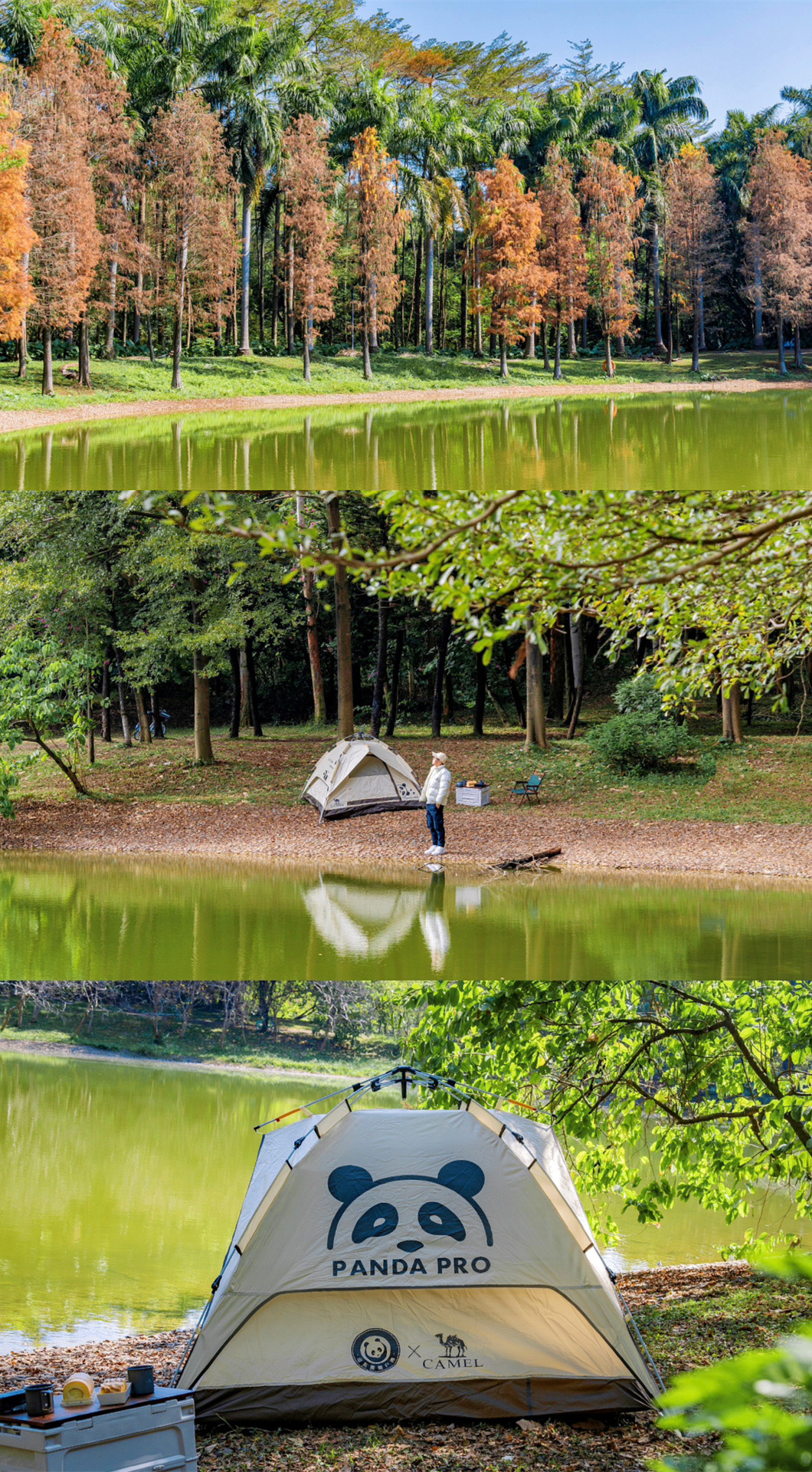 春季一片绿油油,营地周围都是大树遮阴很阴凉,秋季这里的落羽杉变红,是广州露营赏秋好去处~