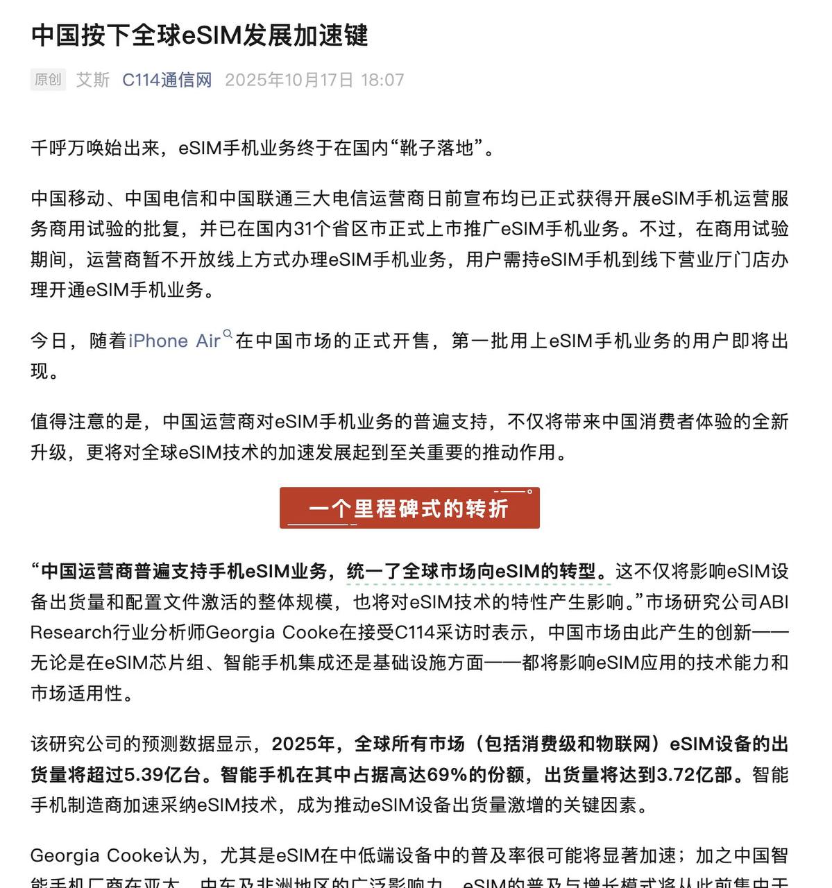 ✅背景简述:eSIM 在中国快速普及,但多数仍需到营业厅操作。