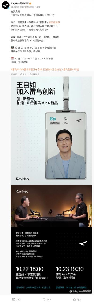 🧩王自如加盟雷鸟创新,将现身 AR 新品发布会