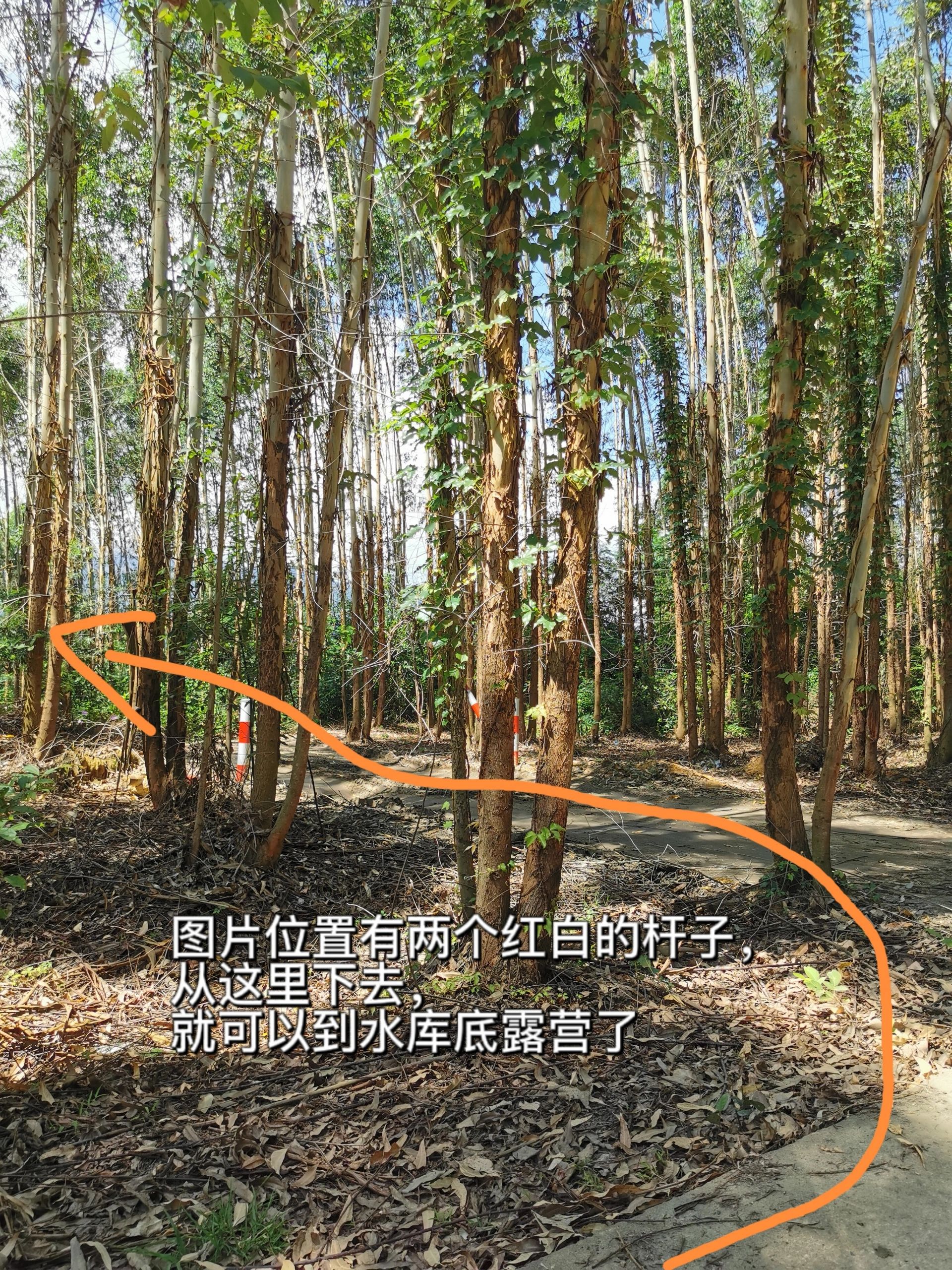 能看到第二个路口,位置比较隐蔽,可以看到路右边有停了一些车,图片位置有两个红白的杆子,从这里下去,就可以到水库底露营了.