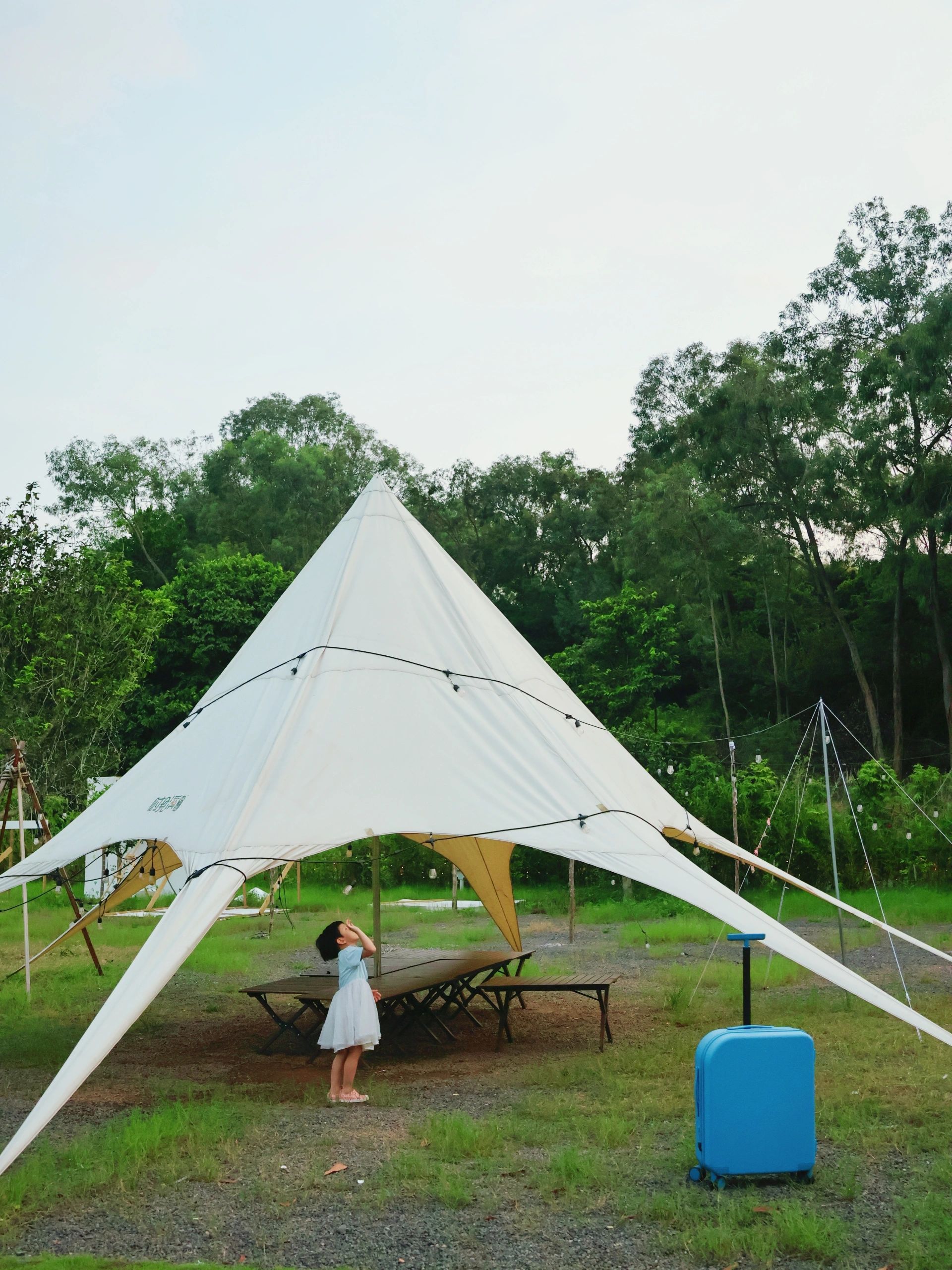 🏕️帐篷错落分布在营地荔枝林里🌿我住的亲子帐篷还有小庭院,有天幕桌椅,露营野餐都可‼️