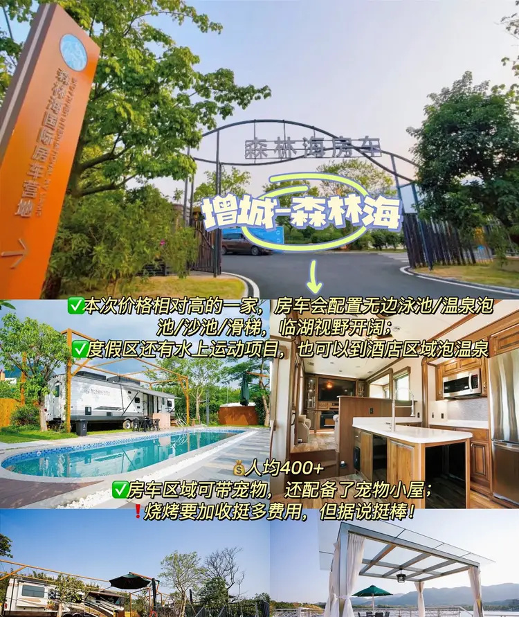 本次价格相对高的一家,房车会配置无边泳池/温泉泡池/沙池/滑梯,临湖视野开阔;度假区还有水上运动项目,也可以到酒店区域泡温泉推荐自驾导航[森林海]免费停车