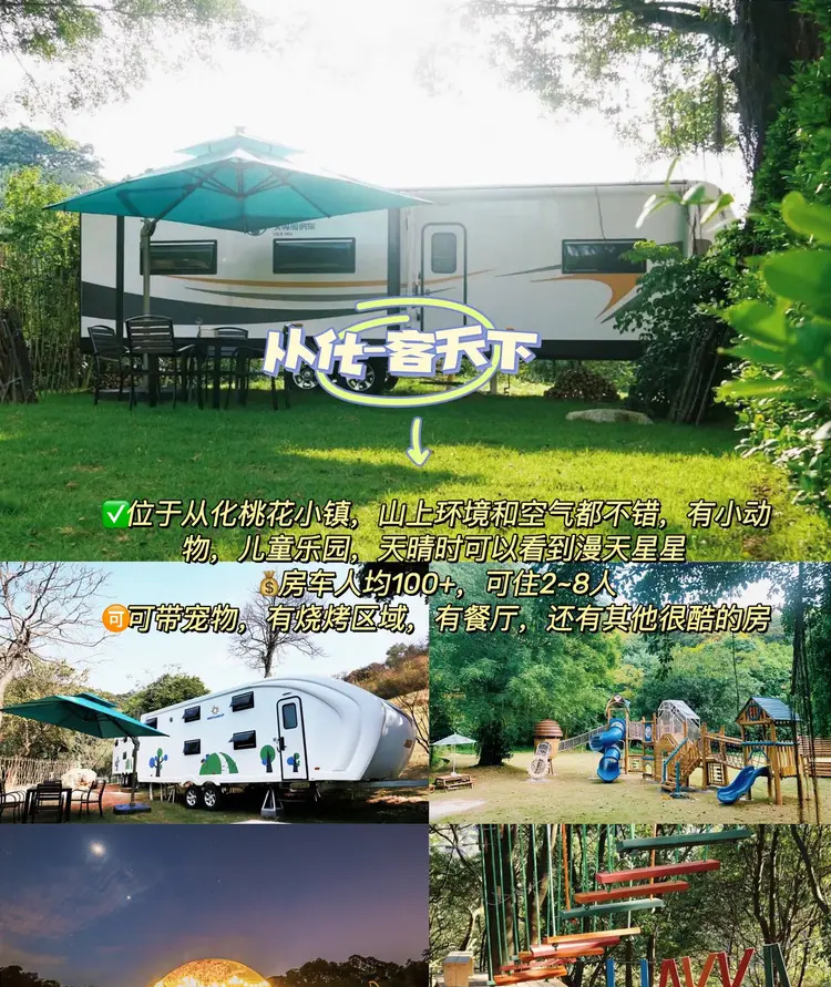 门位于从化桃花小镇,山上环境和空气都不错,有小动物,儿童乐园,天晴时可以看到漫天星星房车人均100+,可住2~8人