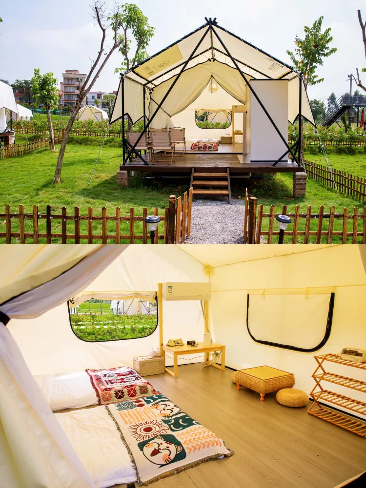 帐篷:10间野奢帐蓬客房点(均配有两张1.2米单人床、独立空调、独立沐浴间、独立小院,私密性高