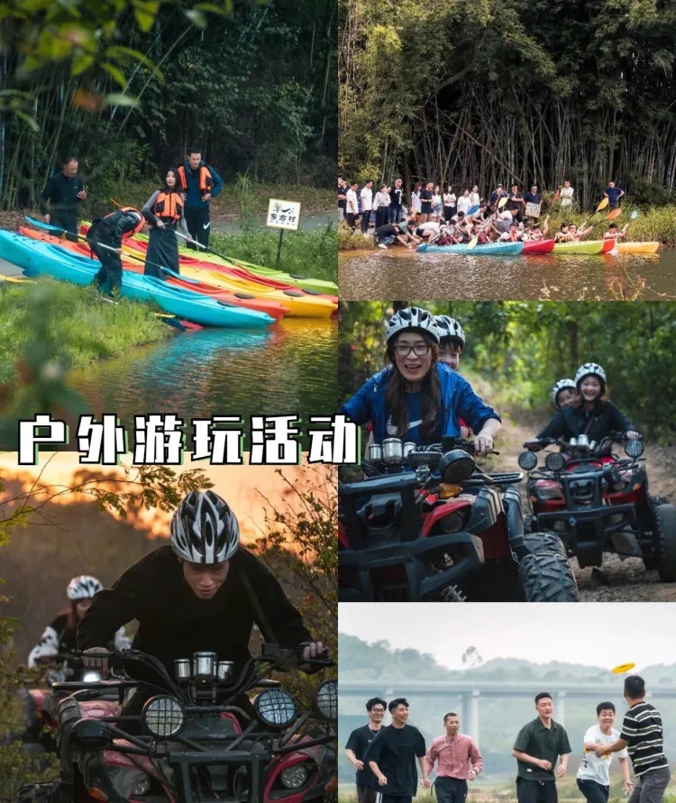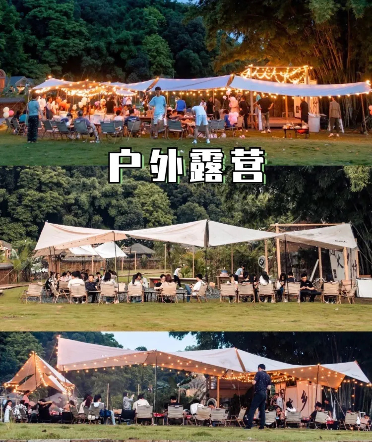 直接抄作业! 不出市也可以开心玩 关于营地 轻奢露营: 轻奢帐篷+全套装备 餐饮: 围炉冰茶中+户外BBQ+户外烤肉 度假村: 东南亚风格+私密度高的森野露营+游戏的大草坪区域 游玩项目:皮划艇女越野车射前飞盘 桌游,户外麻将 晚上还有烟花,仙女棒,团建游玩项目有20种团建活动可供选择! 地址:东方村·团建轰趴露营地