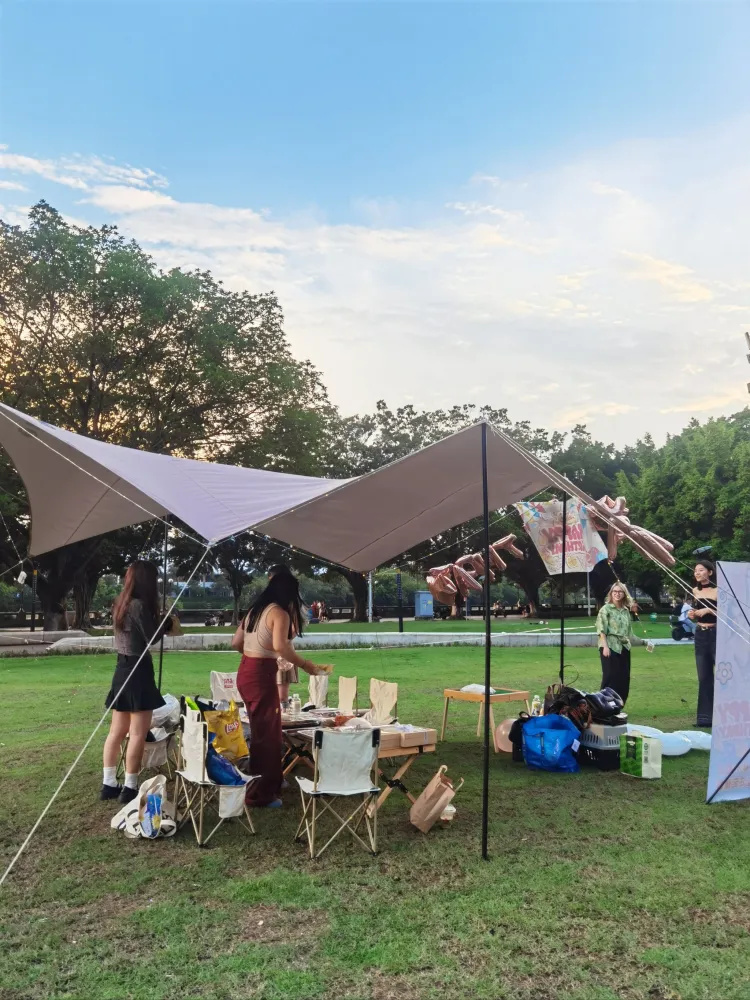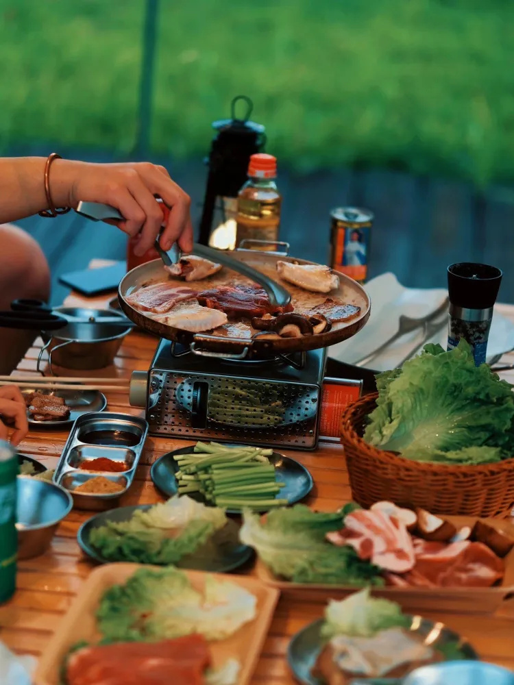 中布署小账篷,烧烤美食,享受生活的各种美好。