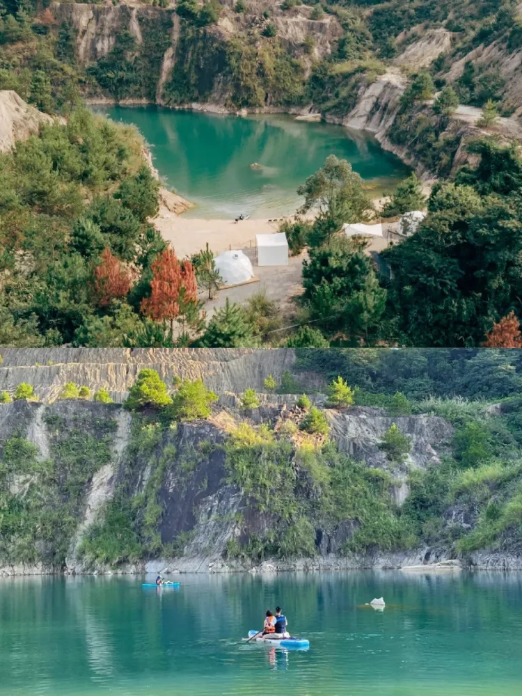 营地拥有天然小沙滩和大草坪,松林分布其中,隔壁还有一个超美的矿坑天池回