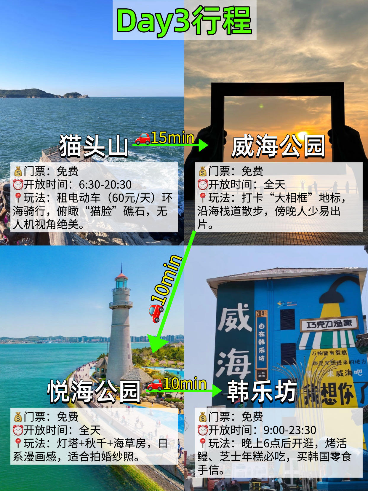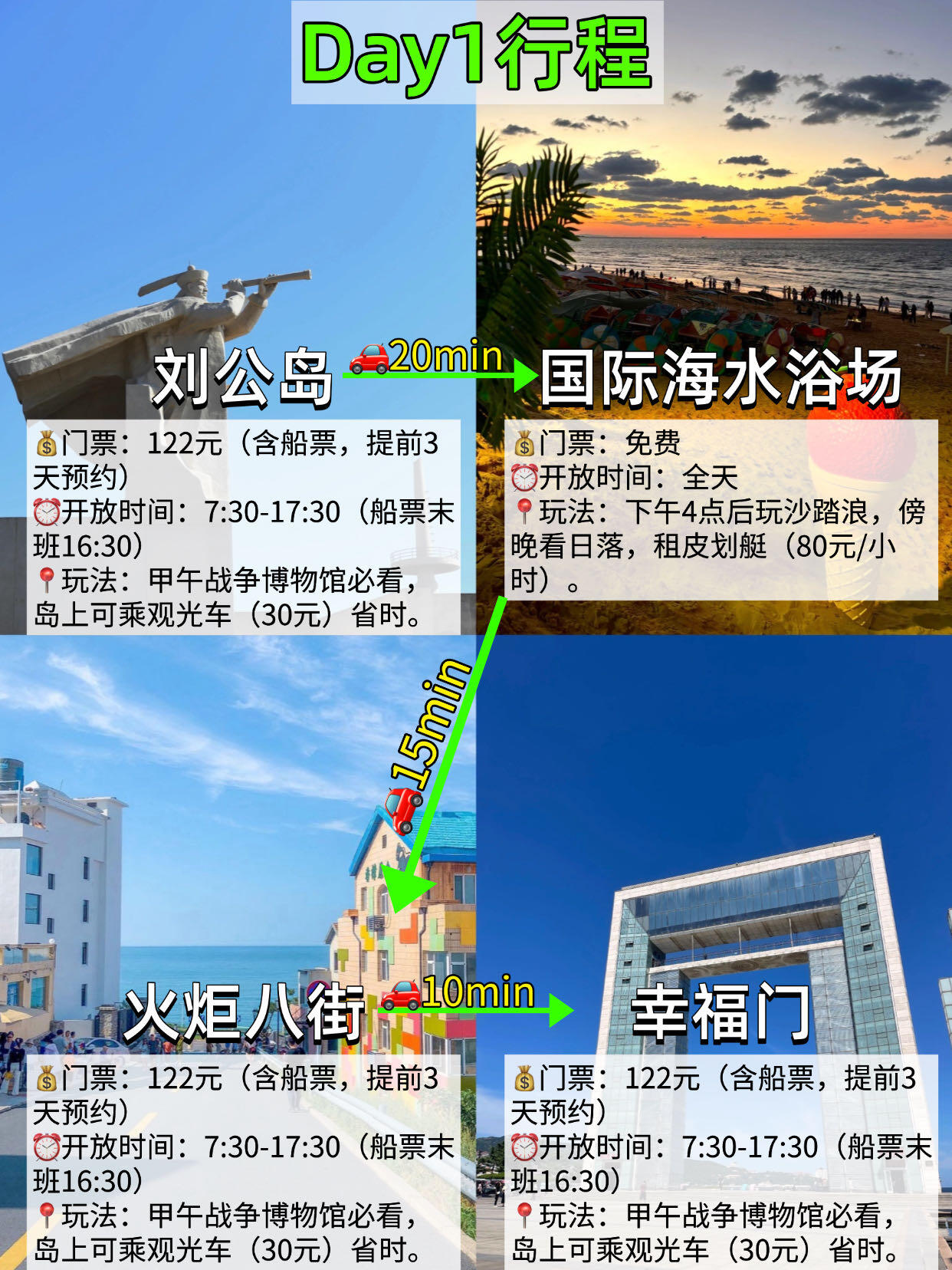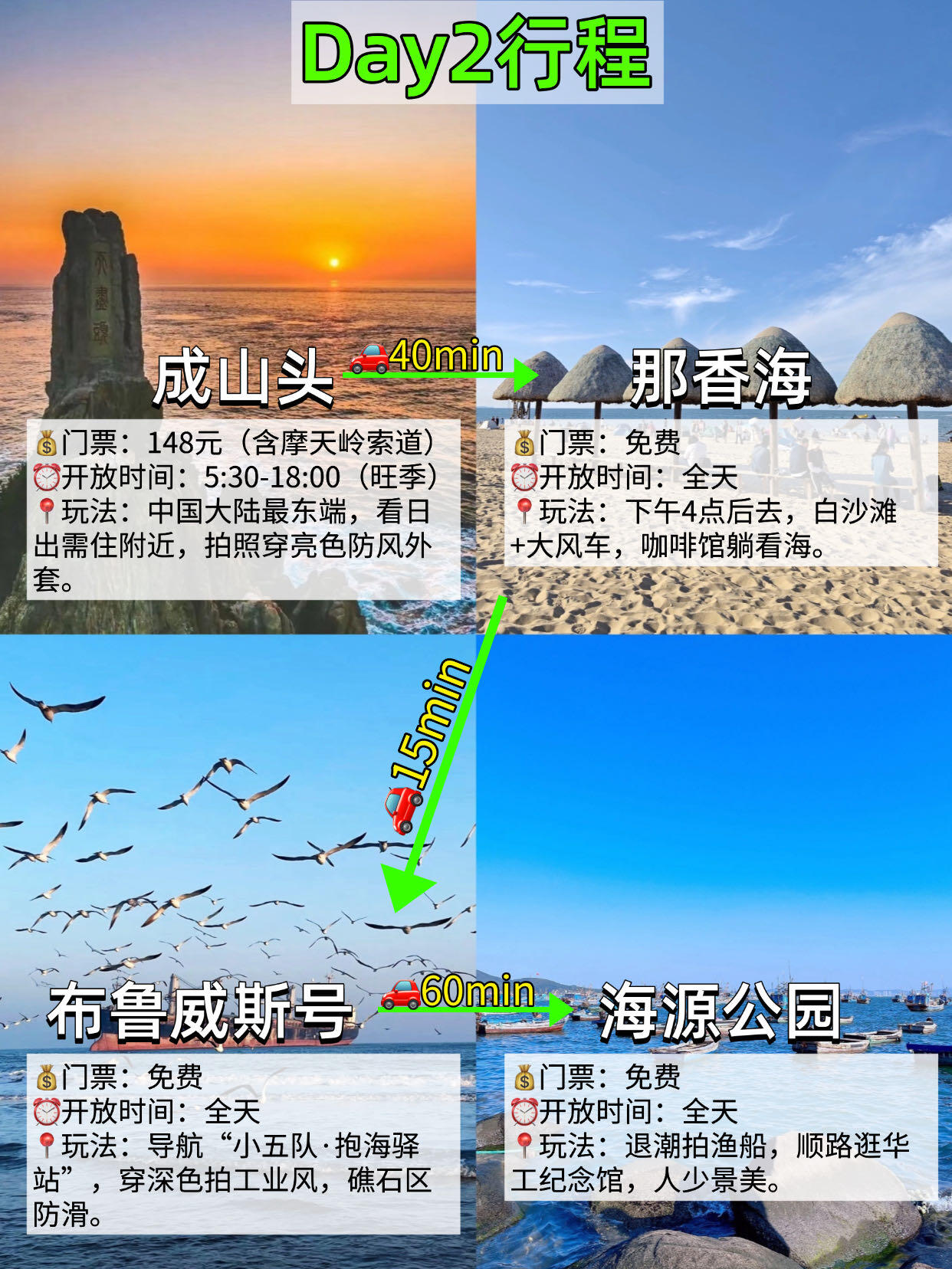Day1:🚢刘公岛(122元含船票)→🌊国际海水浴场(免费)→📸火炬八街(免费)→🗼幸福门(免费,登塔38元)Day2:⛰️成山头(148元含索道)→💎那香海(免费)→🚢布鲁威斯号沉船(免费)→🌅海源公园(免费)