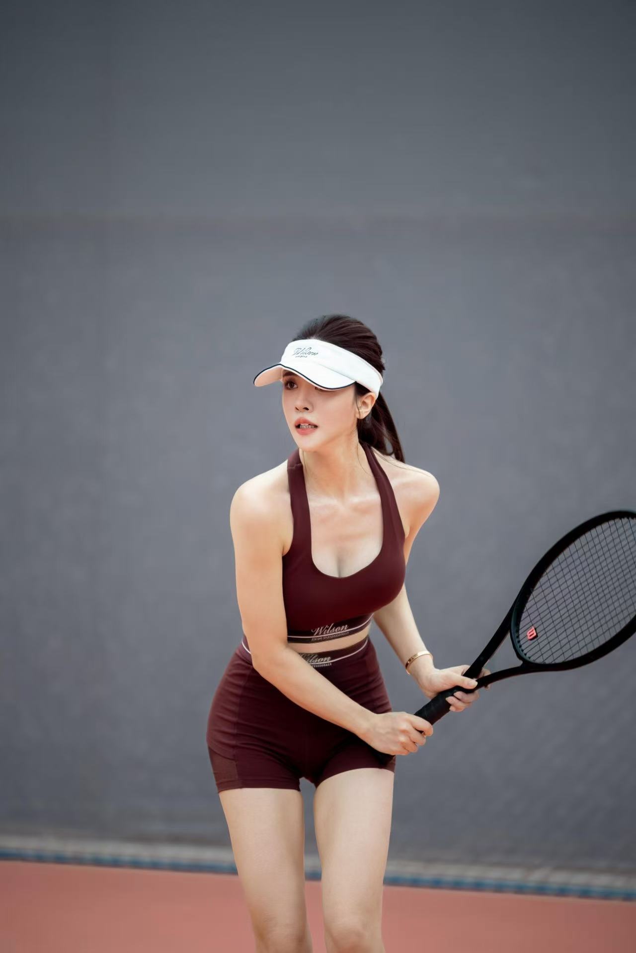 紧致的运动内衣与短裤勾勒出流畅线条,手持网球拍的专注姿态,仿佛下一秒就要上演精彩击球~