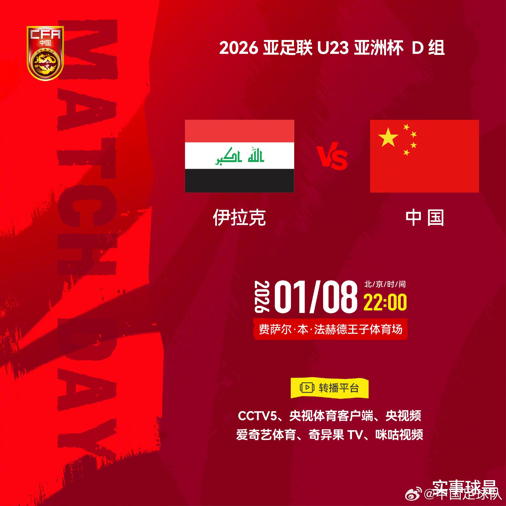 北京时间1月8日22:00,在2026亚足联U23亚洲杯小组赛D组一场焦点对决中,中国U23队与伊拉克U23队在沙特阿拉伯利雅得费萨尔·本·法赫德王子体育场相遇。赛前,两队首发名单公布。