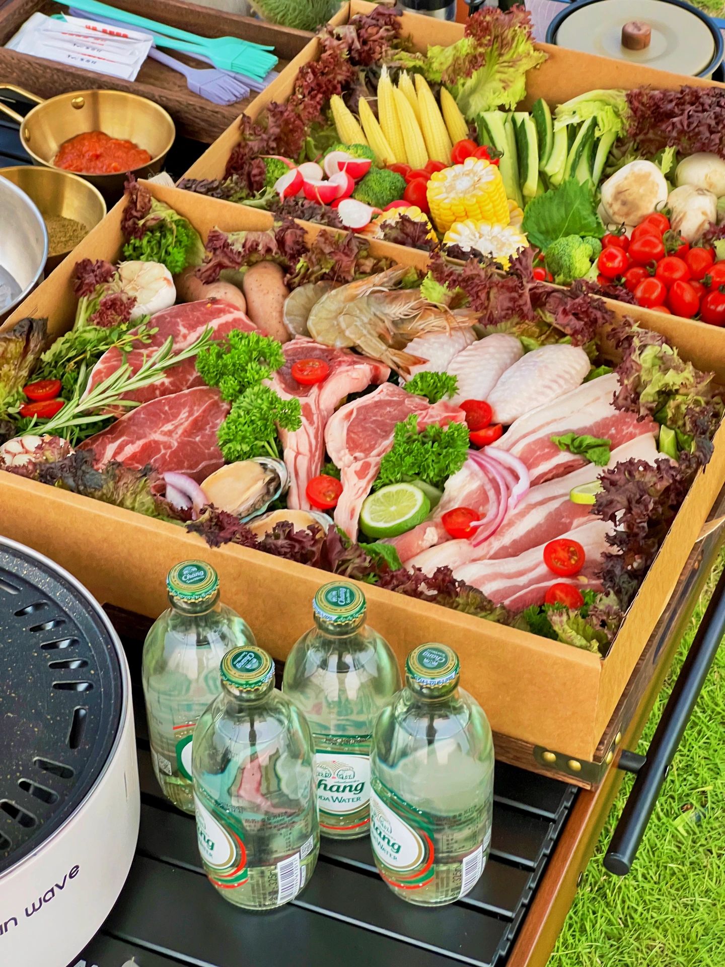 🍽️包装好的烤肉盒子,都是新鲜的食材,荤素搭配,还有水果🍉、饮品🍹~