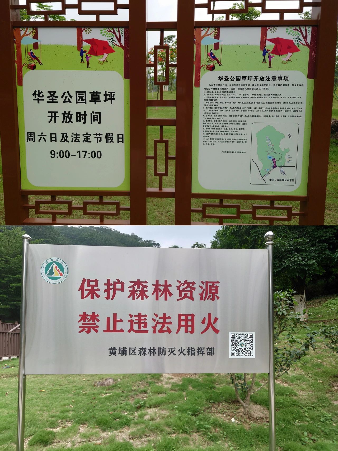 👉营地位于华圣公园入口处草坪,是广州公布首批25个可搭帐篷草坪之一,导航到华圣公园,入口处路边免费停车. 👉草坪在山脚下,草坪区树木种植不久,树木比较小,夏天有一点晒。 👉公园旁边山上是华峰寺,可开车上山。 👉公园内有高压线,景观一般,喜欢爬山的可以去看看。