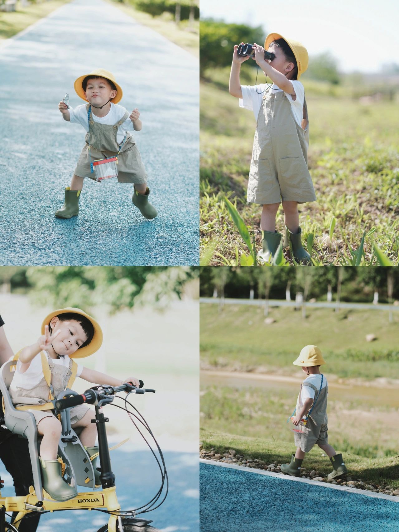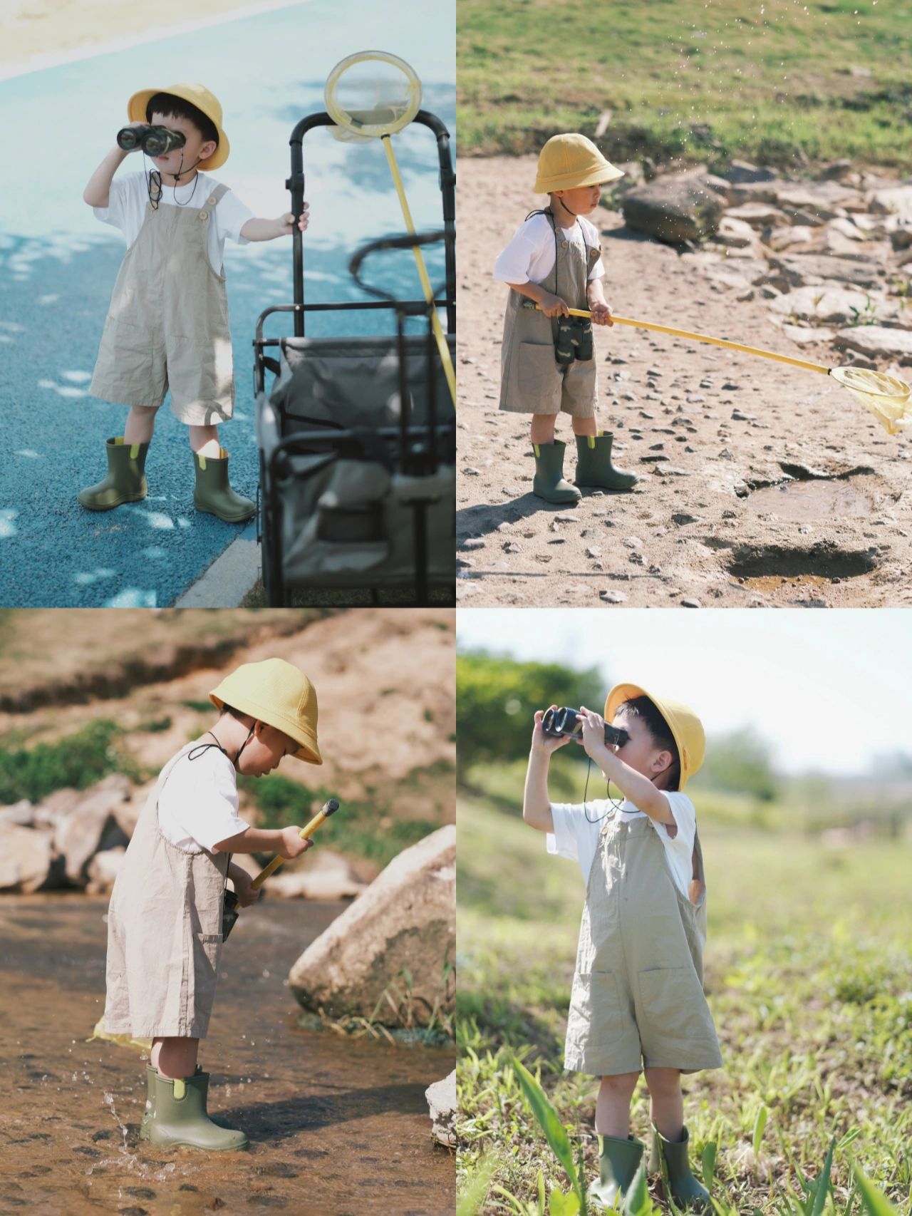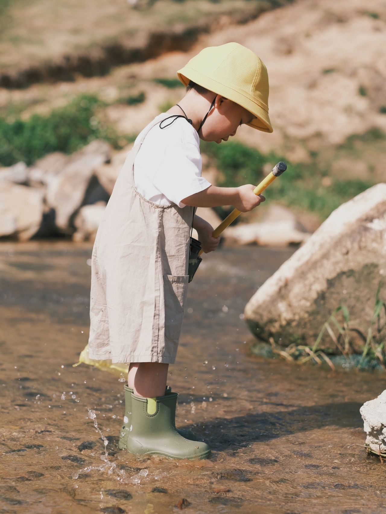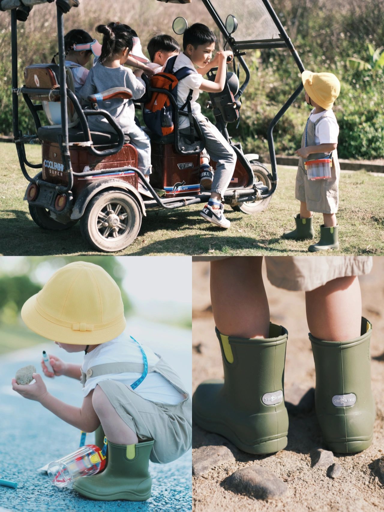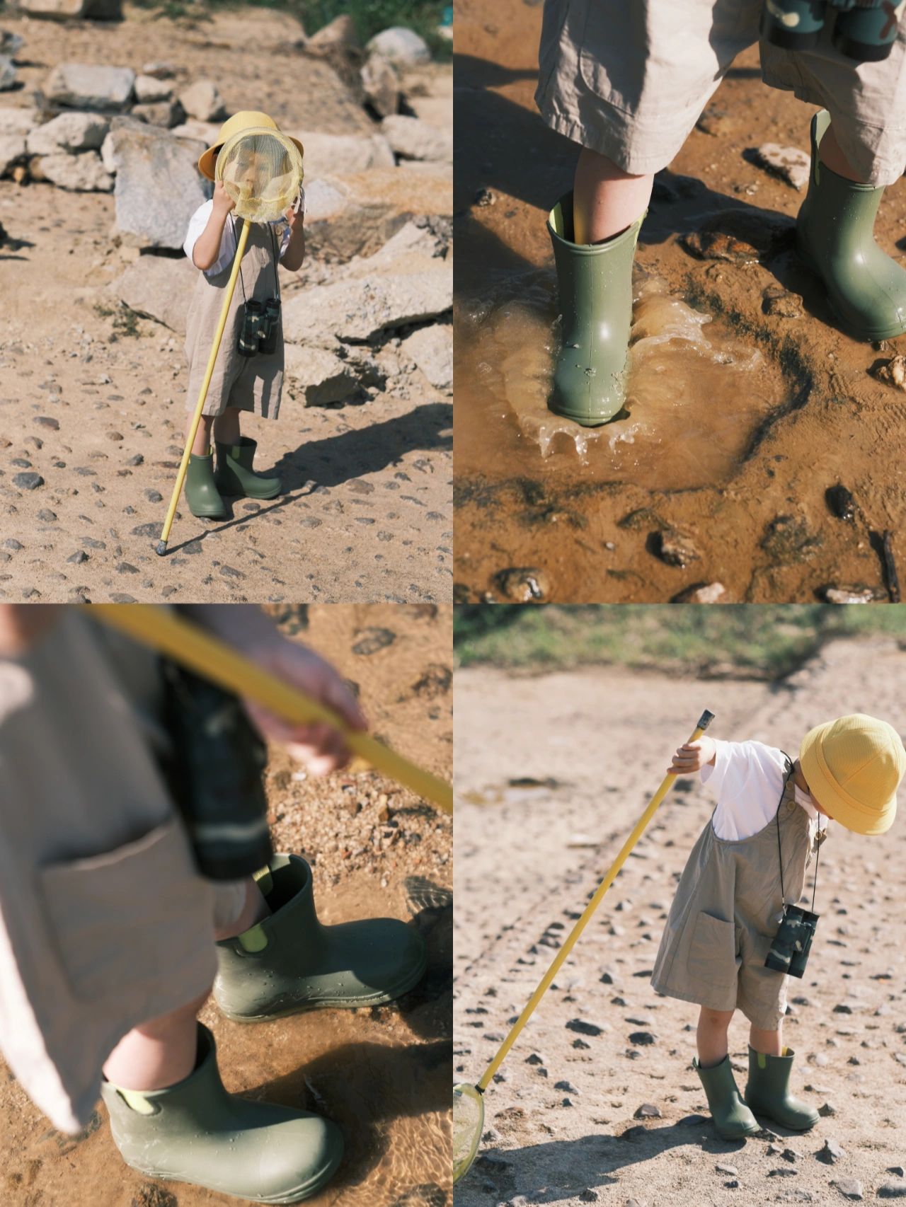 哥哥穿着雨鞋都跑来跑去不累脚。