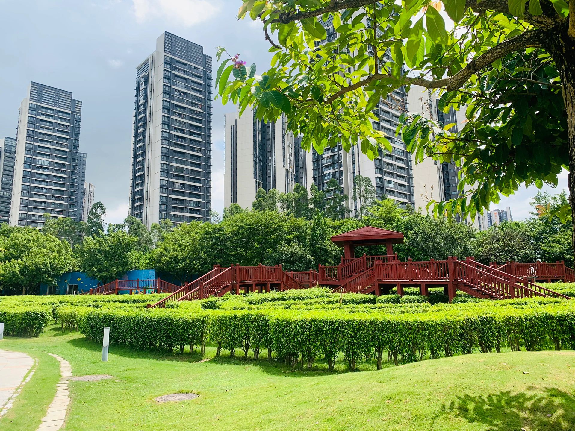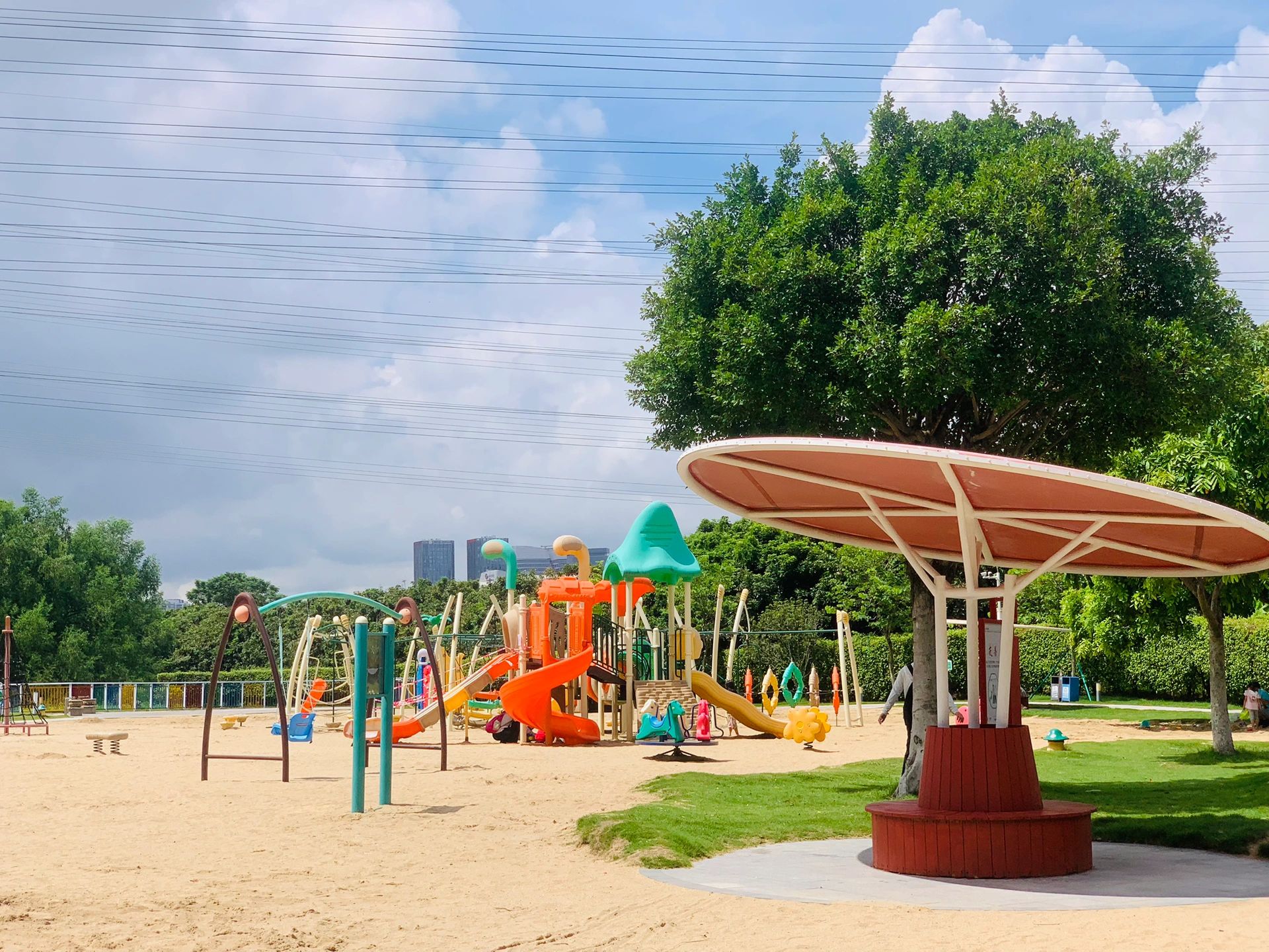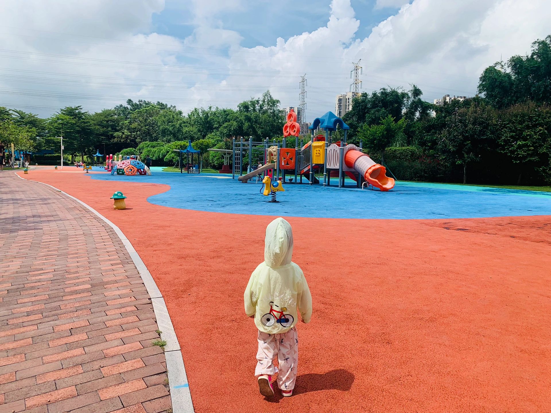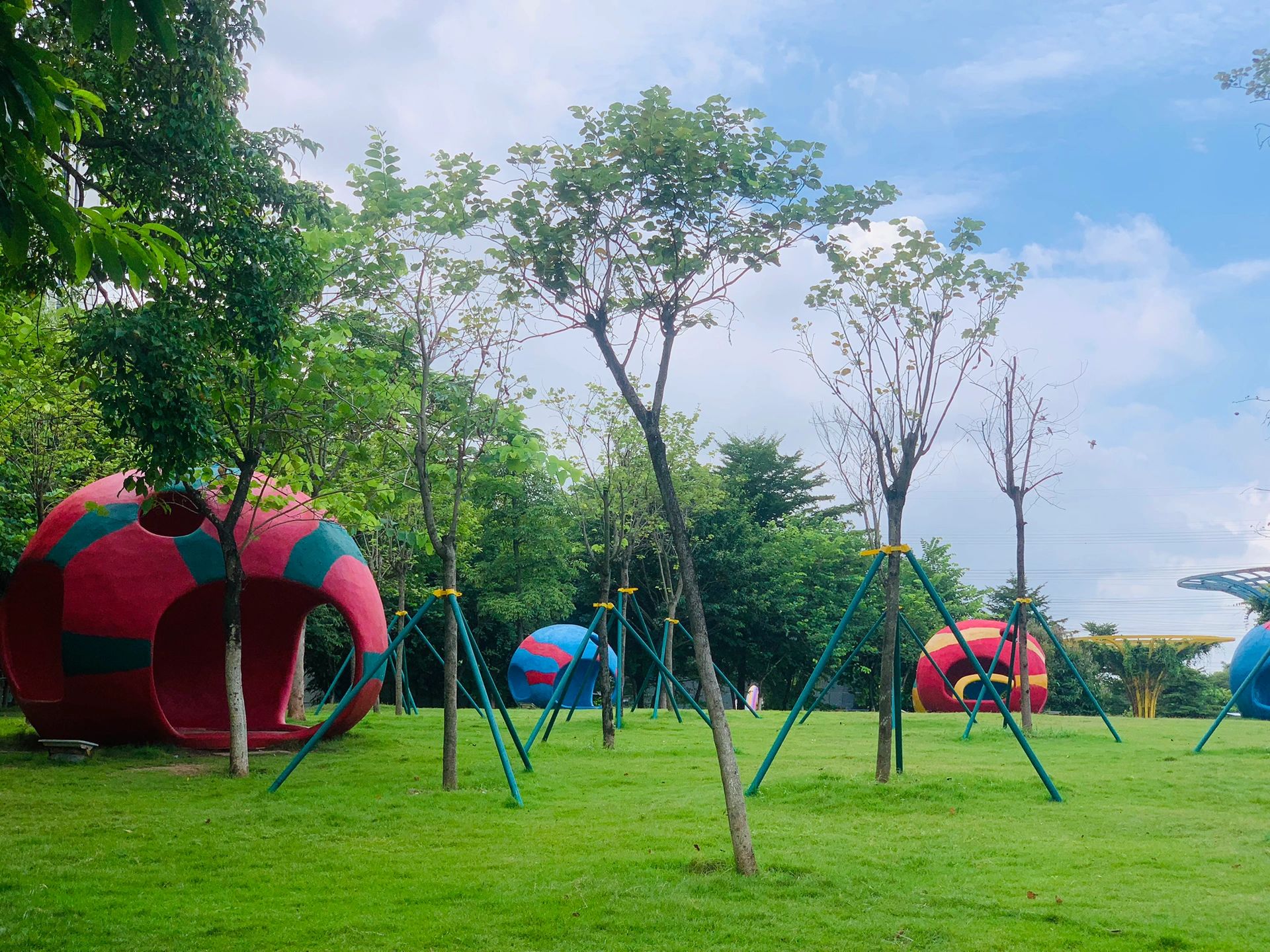 🗺️各种游乐设施,超大沙池,滑梯很多,超大草坪。放风筝人踢球,有足球场口,踩单车的,攀爬,蘑菇屋,植物迷宫!