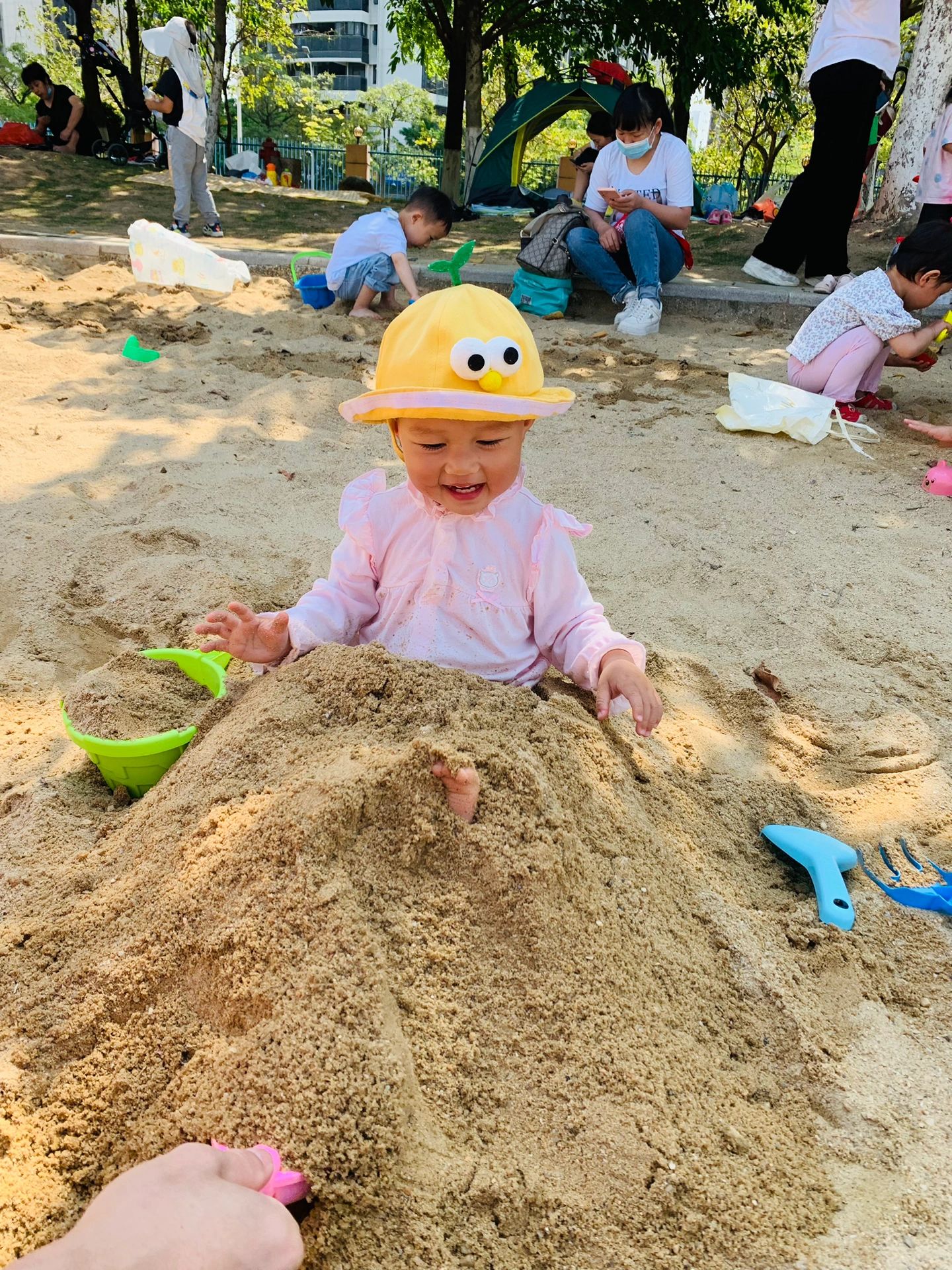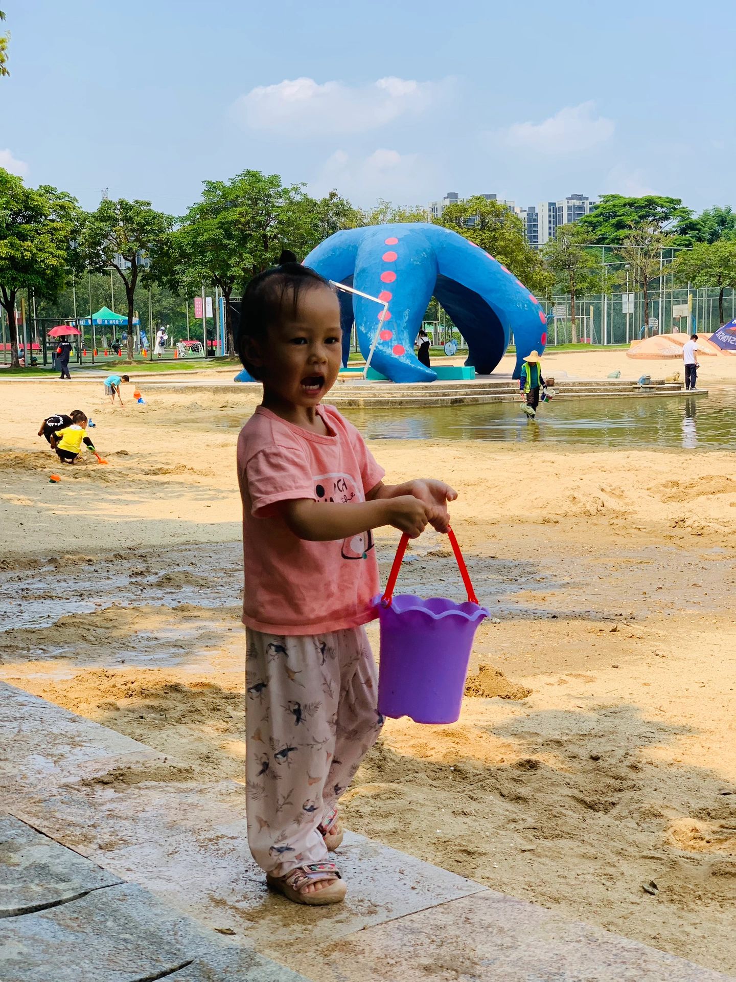 喜欢玩沙记得带齐工具哦。也有水池,记得带套衣服,不想让玩下水池玩的也可以直接让娃自己去旁边的水龙头接水玩!