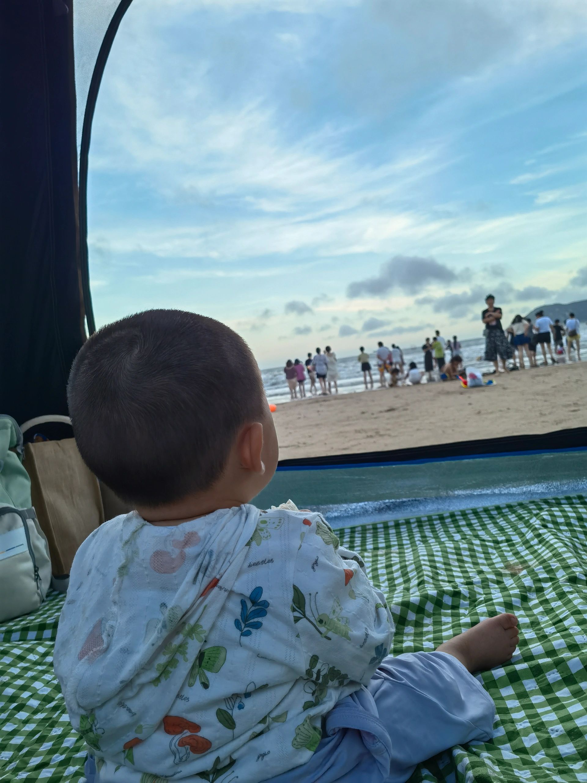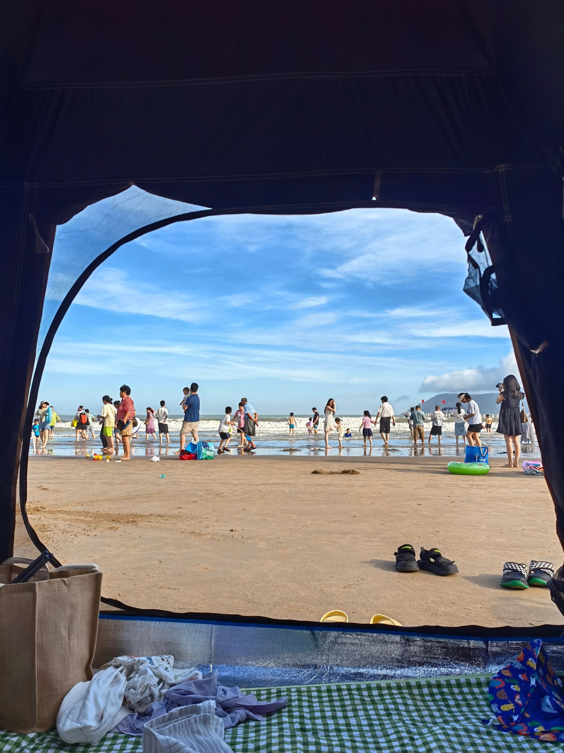 周末去了舟山的南沙景区,大沙滩好热闹~ 选了左边人少一点的区域搭了帐篷,还吹起了充气沙发~ 不得不说,拉着露营车从景区门口进去的一路显得傻乎乎的,但是到了海滩上搭起来是真的太nice了~ 帐篷除了遮阳放东西,还可以作为家人们的碰头据点,防止有人走丢。 躺在沙发上喝着奶茶看海浪吹海风也真的是太舒服了虽然在沙滩上是有人路过都要多看两眼的程度. 属实没想到露营装备在海滩上可以提升超多幸福感~下次再继续解锁新场景哈哈!