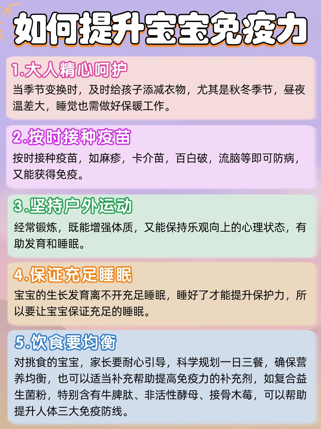 现在换季🍂了,很多宝宝也陆续开学,又到了妈妈们蕞揪心的时候,每天的心愿就是宝宝身体健康、少生病。除了生病时好好护理,平时增强自护力才是关键‼今天整理了可以增强免疫力的8类食物和5个增强自护力的有效方法,新手爸妈赶紧学起来。