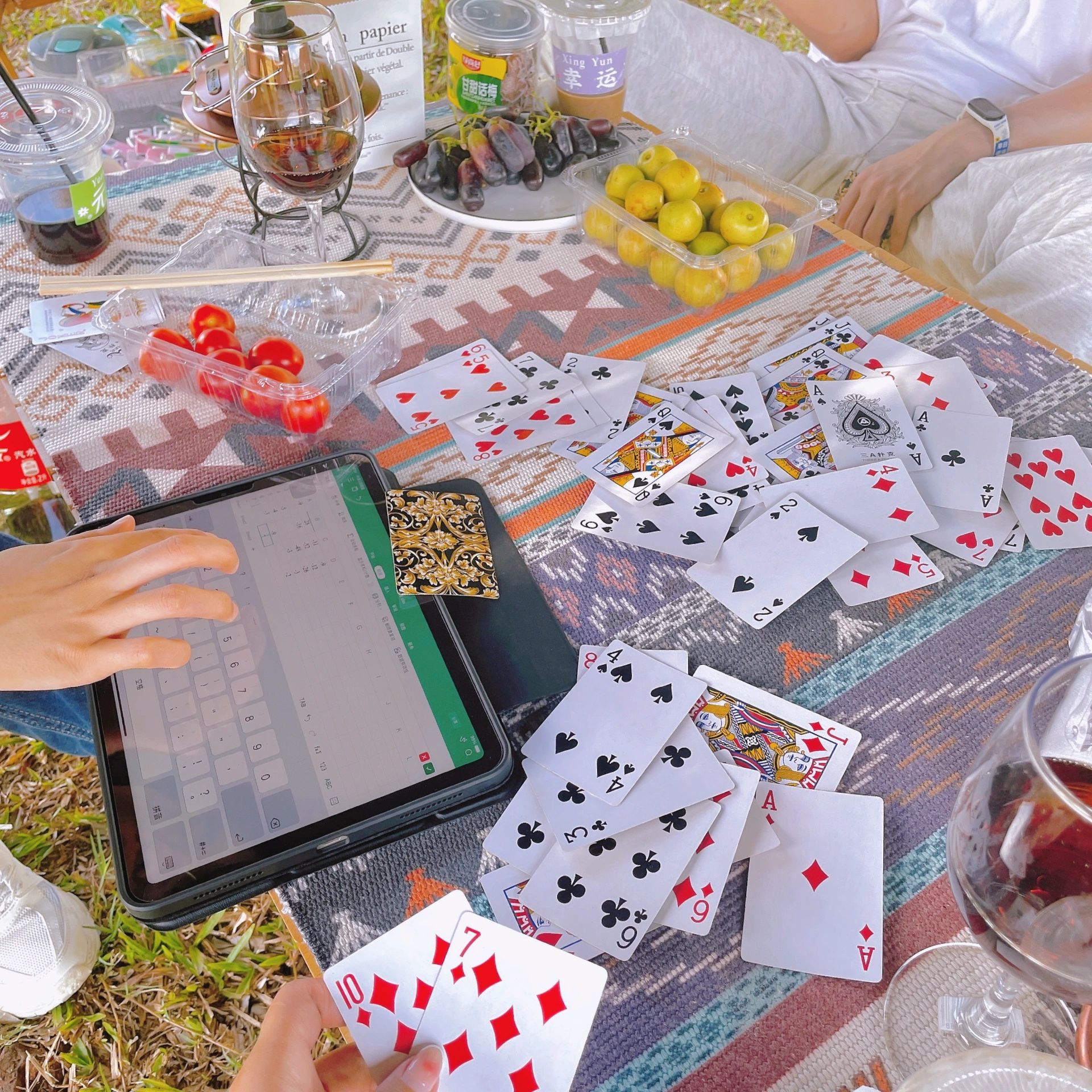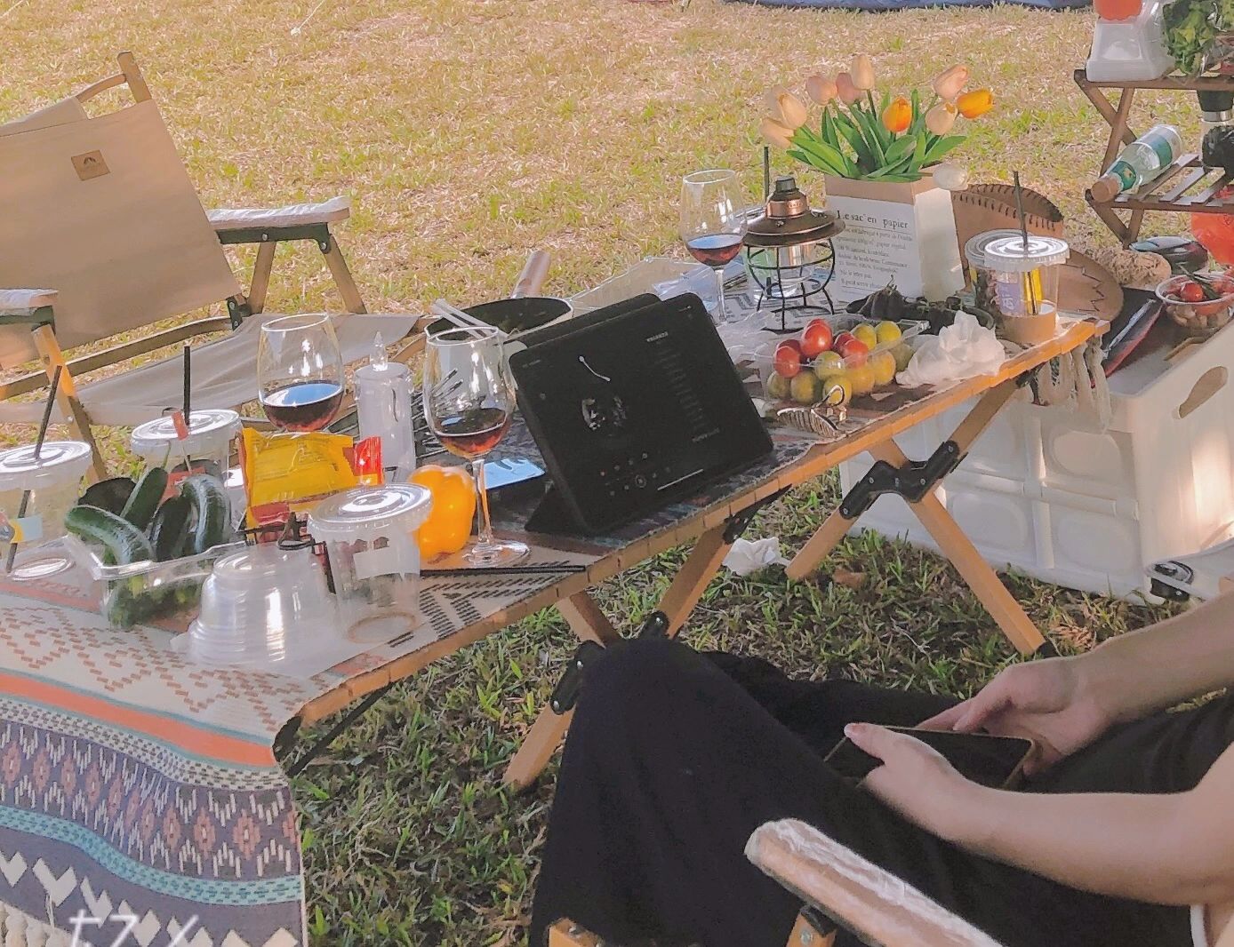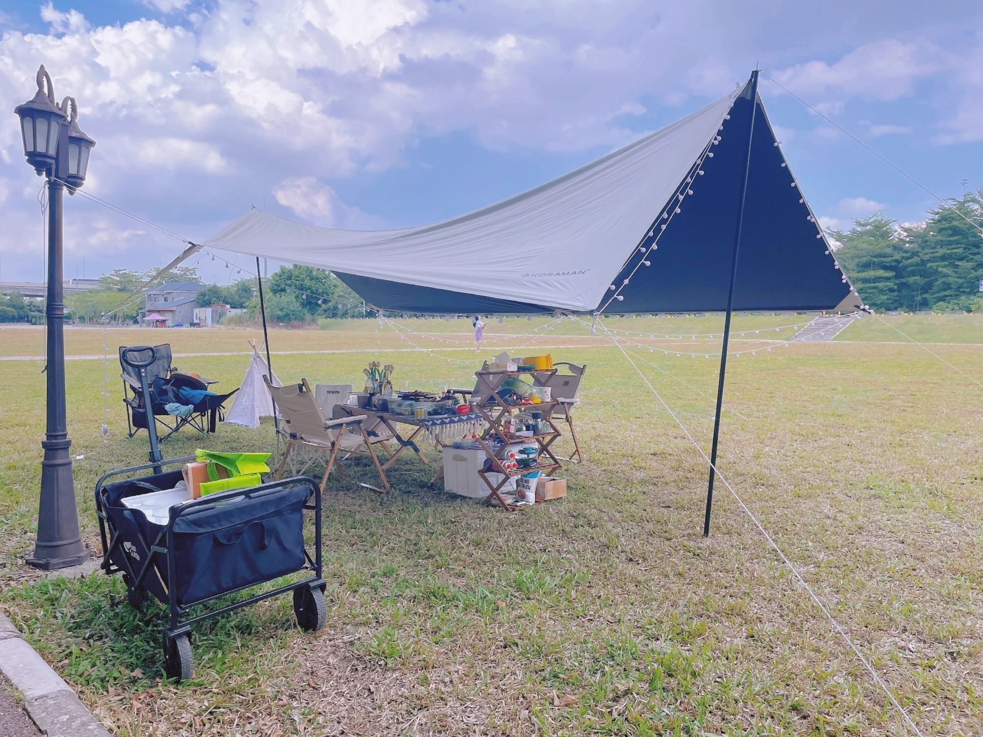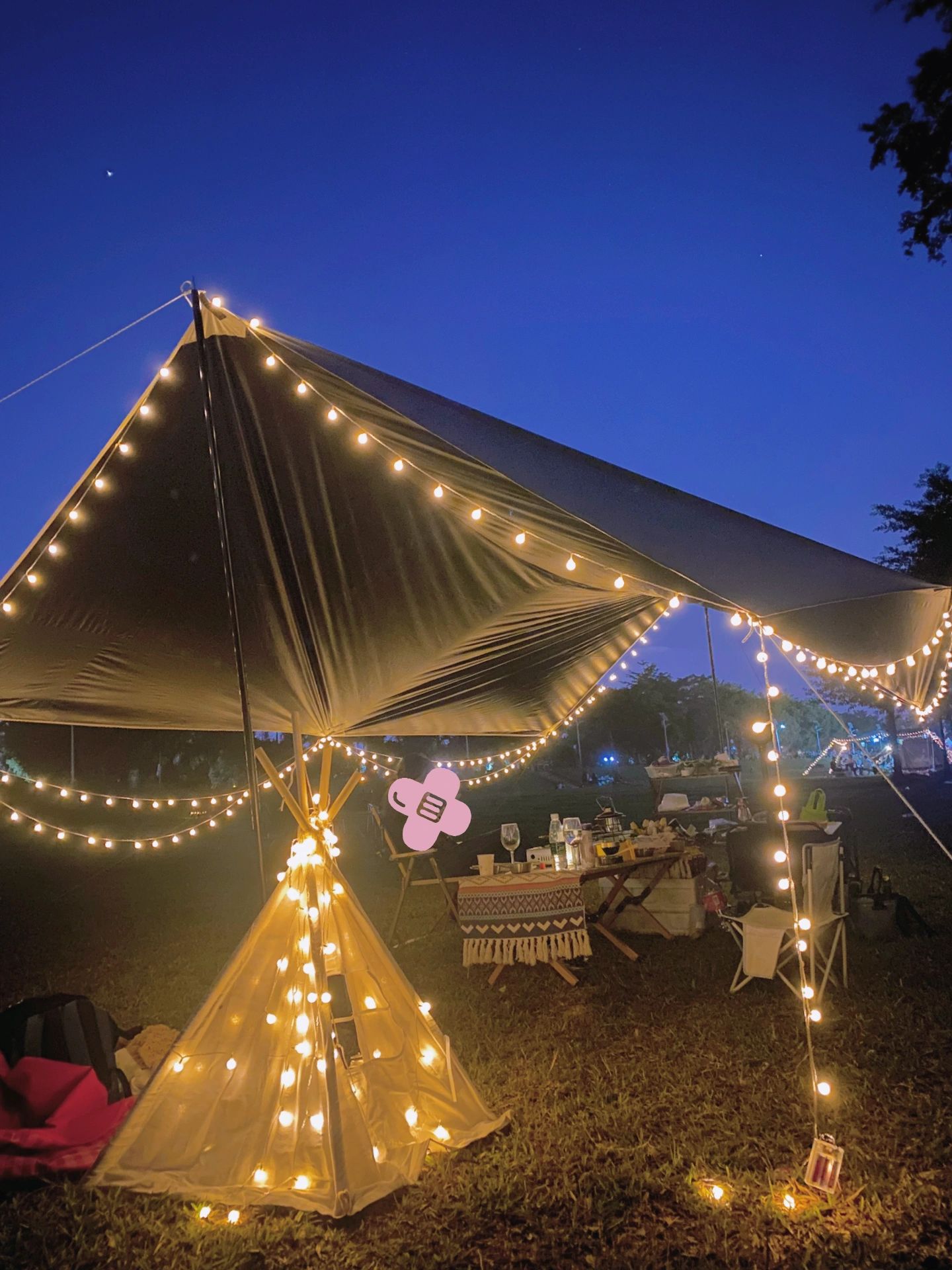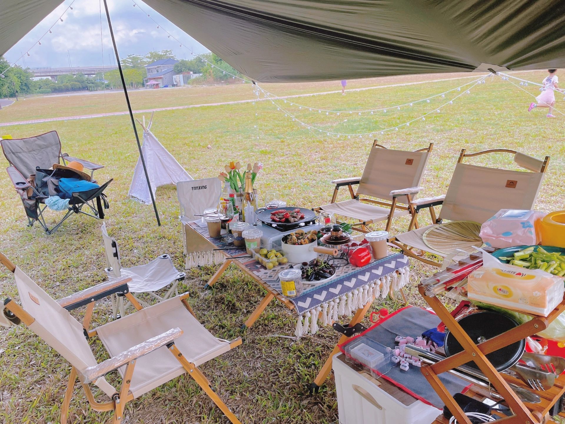 ⛺️设备搭建:男生主要负责天幕、氛围灯,摆桌椅;女生清洗蔬菜水果准备晚餐