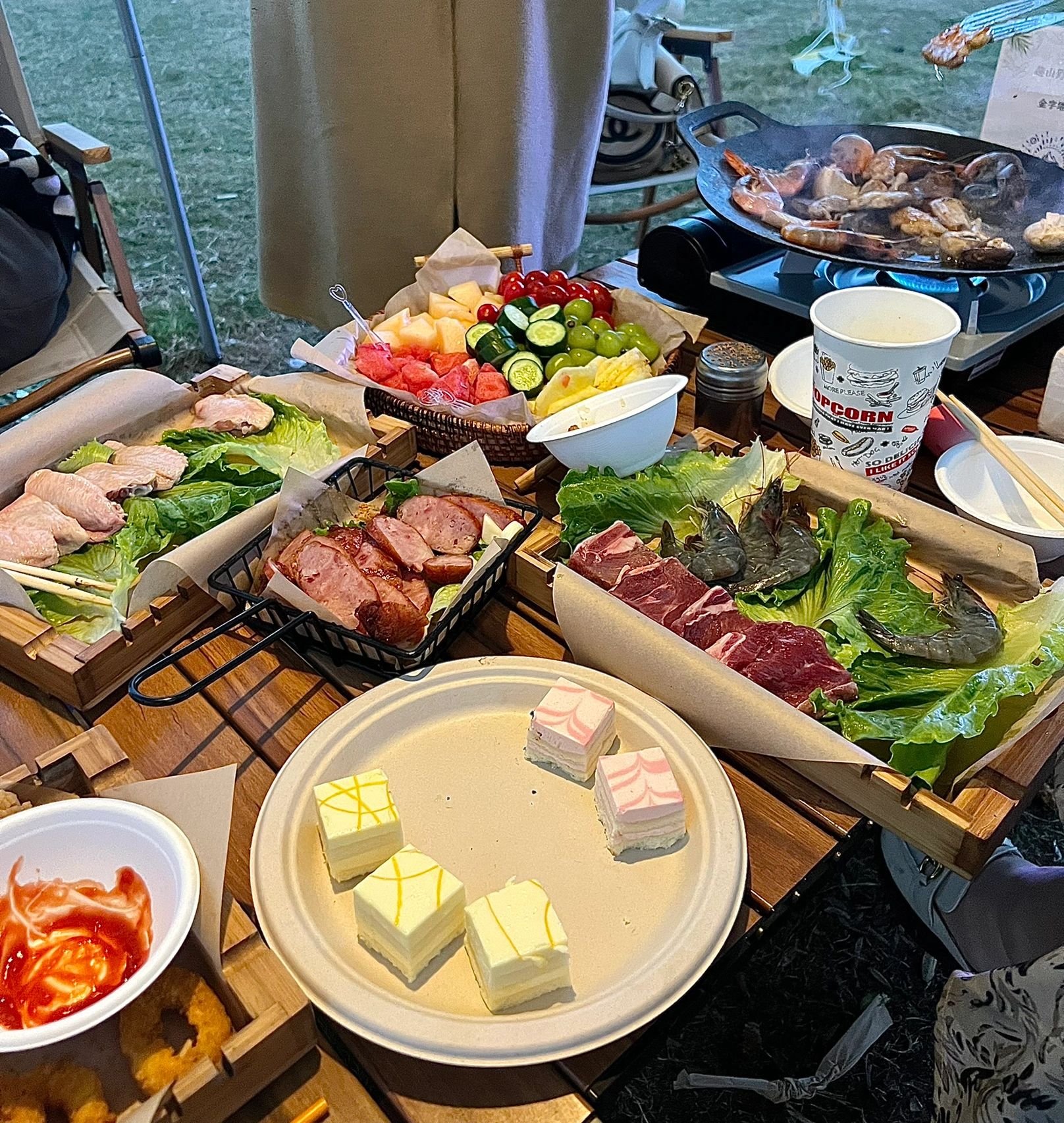 我和5位小姐妹 食材有点少 味道差点意思希望可以改善改善 去的当天15度冷死了🥶 工作人员有准备碳火炉 现在秋天了,要去的宝贝们记得多带件外套,晚上会有点凉. 📍: 五披下附近 趣山野(花溪营地) 🈺️: 白天9:00~16:00 晚上16:30~23.30 💰:人均128 丰俭由人
