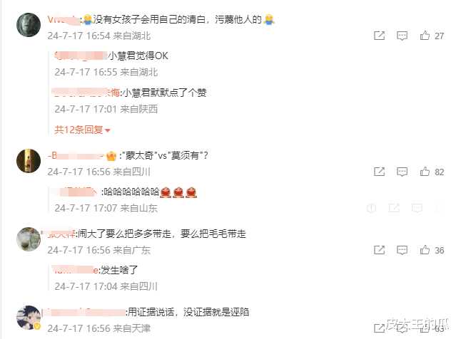 不过接下来的这位网友认为Kris是想在临走之前整一波大的,直接带走王多多。还有一部分人是支持Kris的,并表示:没有女孩子会用自己的清白污蔑他人,可是结果网友们直接拿出来了小慧君作为案例,还有就是文案中的蒙太奇也直接被网友解读为了“莫须有”。