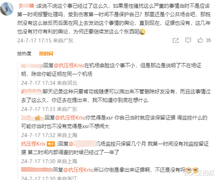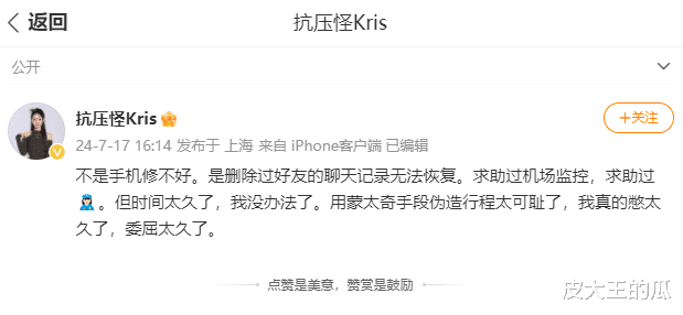 而Kris发文写到:“不是手机修不好。是删除过好友的聊天记录无法恢复。求助过机场监控,求助过警察。但时间太久了,我没办法了。用蒙太奇手段伪造行程太可耻了,我真的憋太久了,委屈太久了。”这段话也是直接引起了热议。