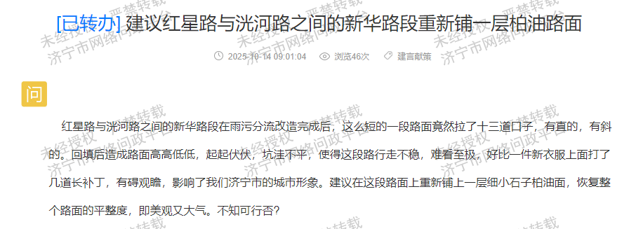 近日,济宁名城事小编相关渠道获悉,有网友通过济宁市网络问政平台提出了一项关于道路修整的建议。