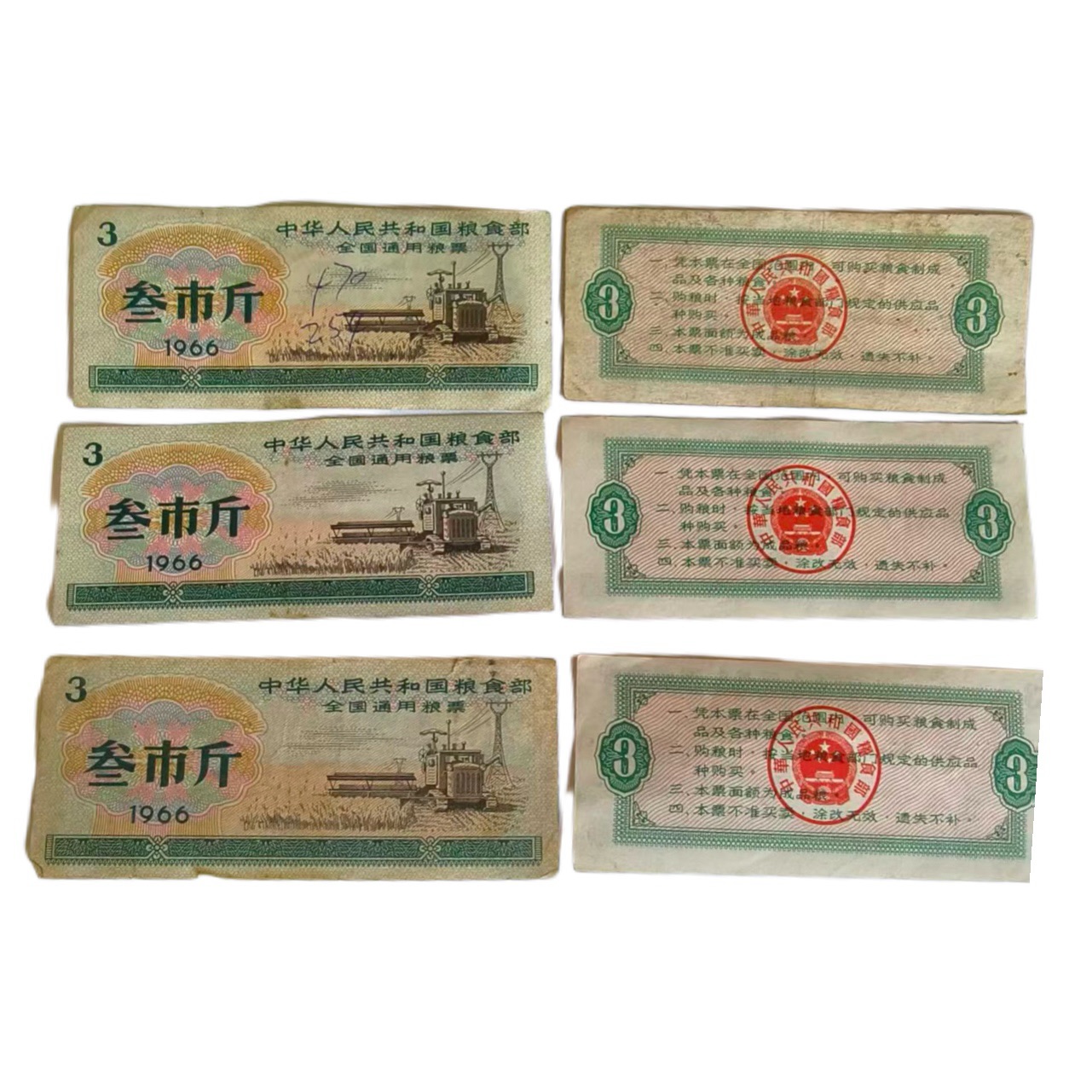1966 年叁市斤粮票,见证了中国从计划经济体制向市场经济体制的艰难转型。在计划经济时期,粮票是经济运行的核心工具,维系着整个社会的粮食供应体系;而随着改革开放的推进,市场经济体制逐步建立,粮食生产得到了极大的发展,供应日益充足,粮票的作用逐渐式微,最终退出了历史舞台。粮票的兴衰历程,清晰地折射出中国经济体制的深刻变革,为研究中国经济发展轨迹提供了珍贵的实物资料。