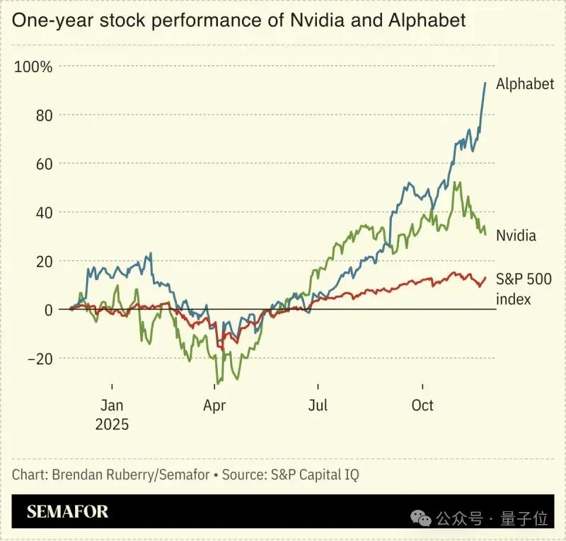 根据金融数据服务商SP Capital IQ的数据,今年1月至11月期间,谷歌母公司Alphabet与英伟达的股价表现均大幅跑赢标普500大盘。