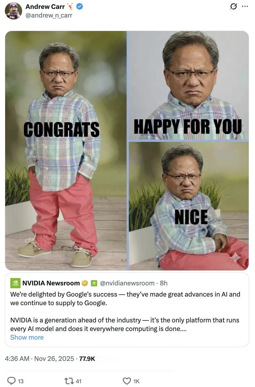 Google BrainOpenAI前员工Andrew Carr晒出调侃表情包,暗喻老黄此刻的心态:你happy我不happy。