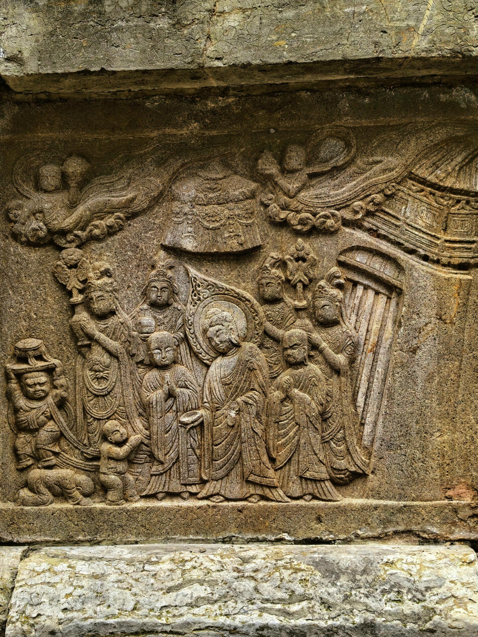 除了那些声名远播的建筑,灵岩寺还有许多值得细品的隐秘角落。三大殿遗址上,残垣断壁间依稀可见当年的规模,散落的柱础上,莲花纹依然清晰,让人忍不住想象曾经的雕梁画栋;御书阁里,几块斑驳的石碑讲述着帝王将相的过往,虽历经风雨,碑文中的字迹仍透出威严;积翠证盟殿里,唐代的石佛端坐在天然洞穴中,身后的崖壁上,历代文人的题刻层层叠叠,像是一场跨越千年的对话。