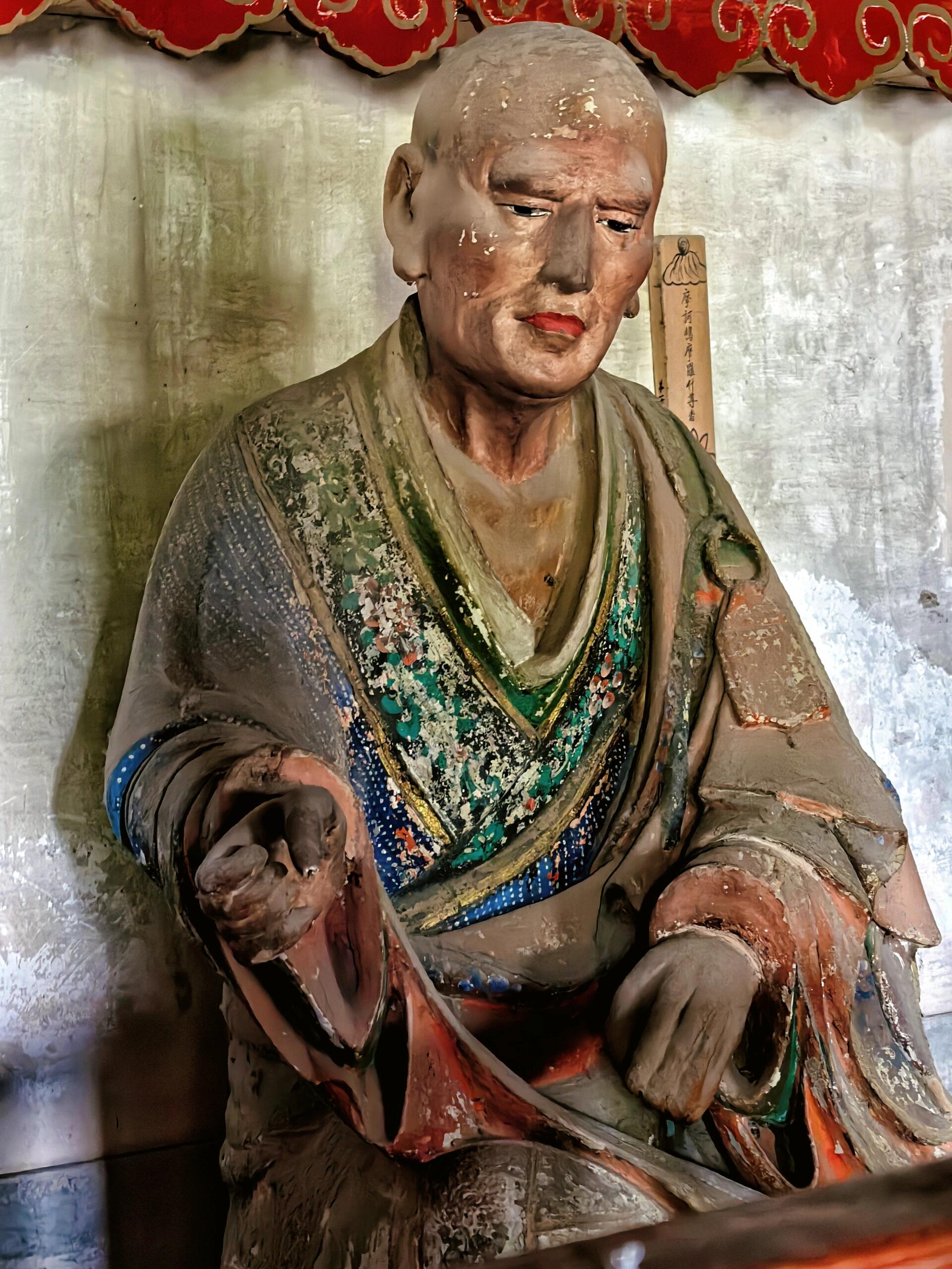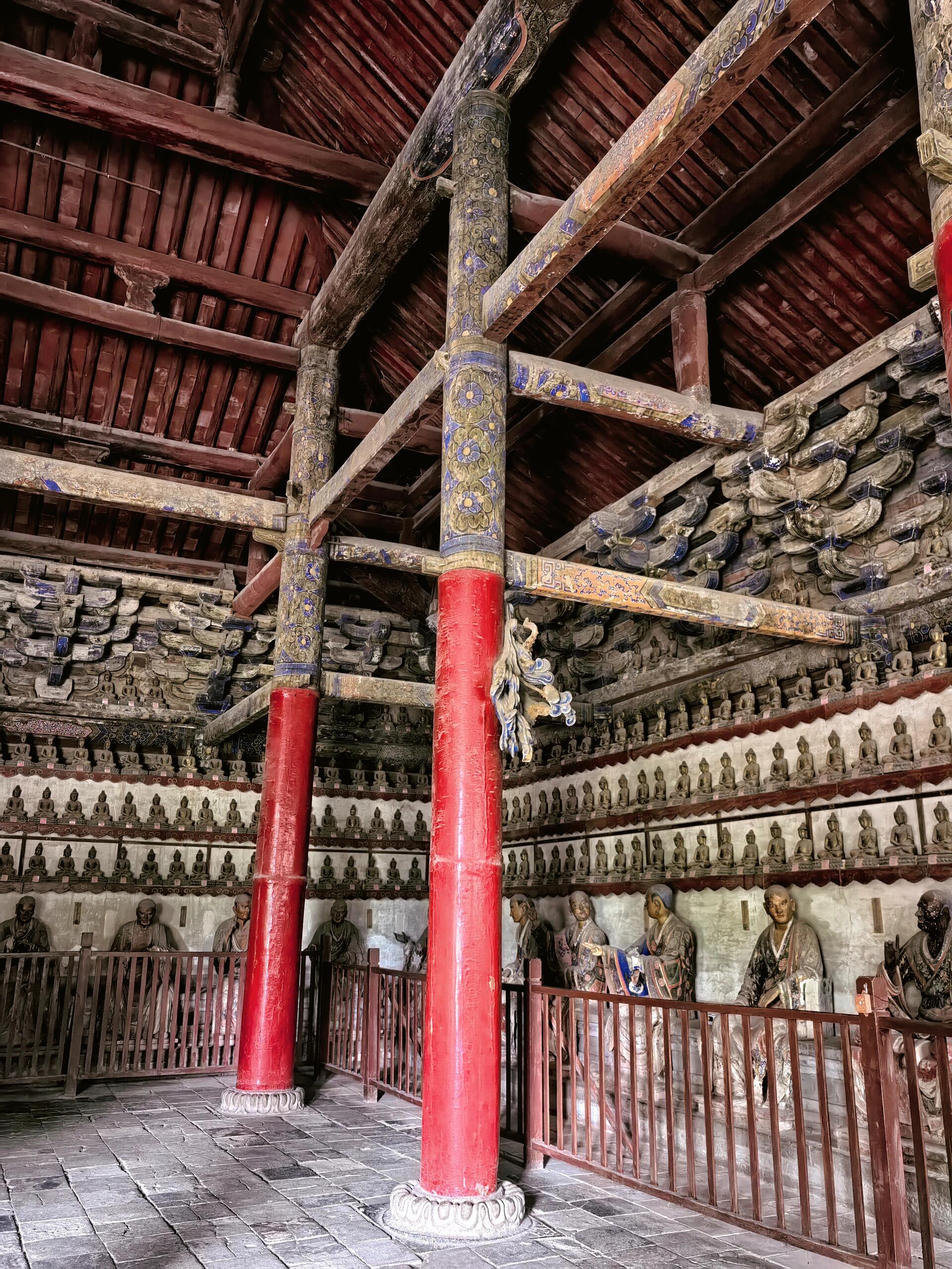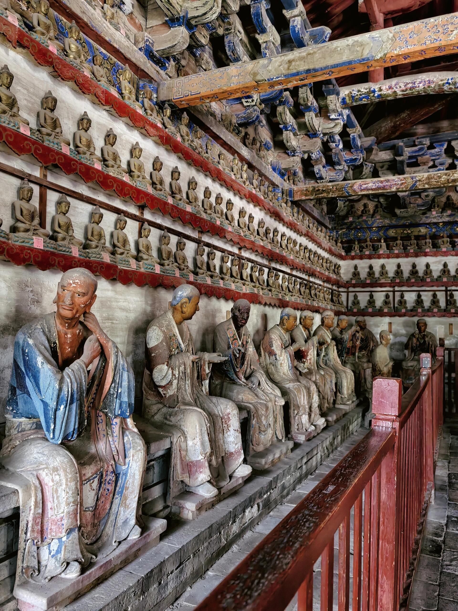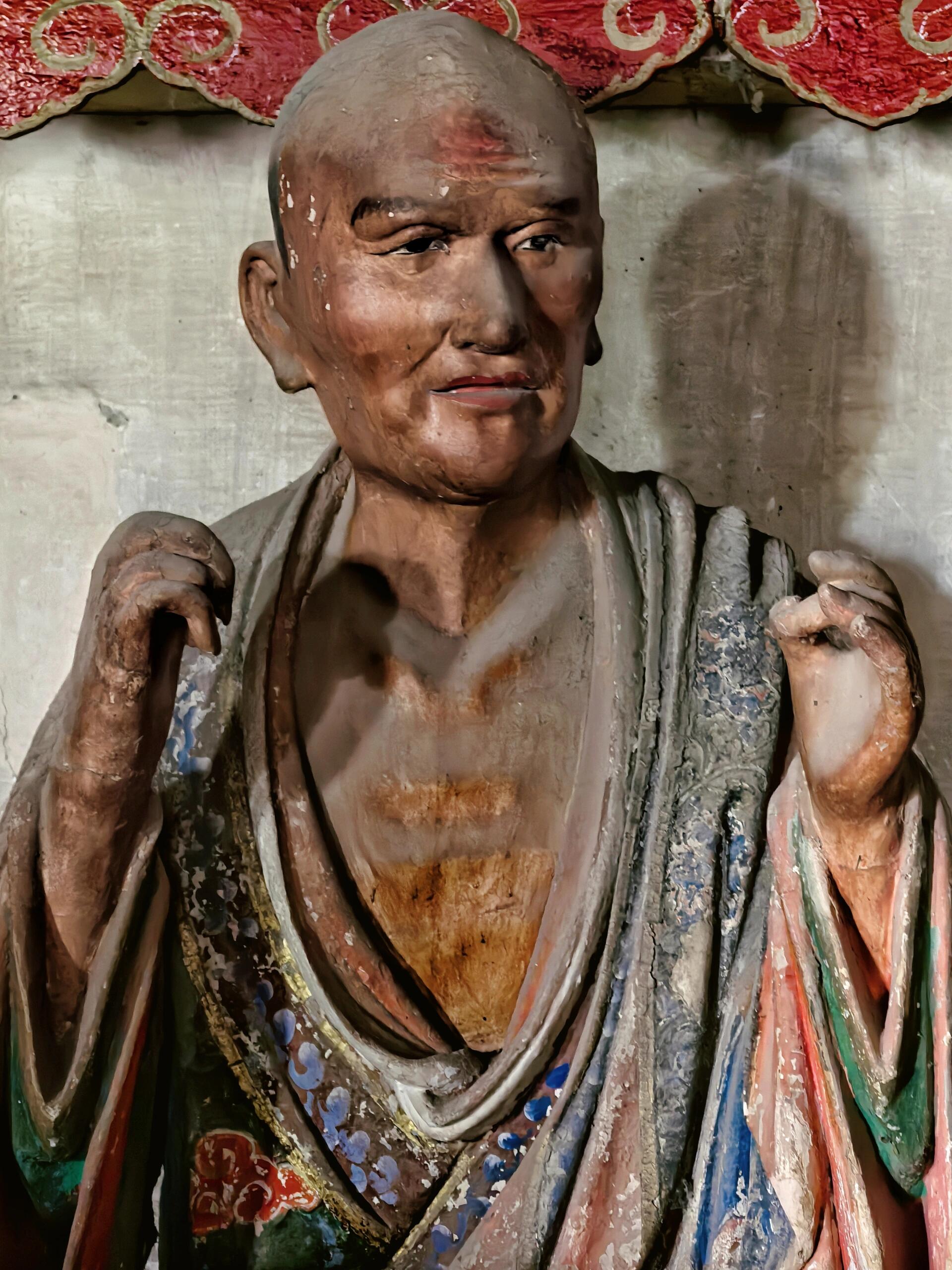 殿内的40尊宋代彩塑罗汉才是真正的灵魂。他们不像常见的佛像那样正襟危坐,而是各有姿态:有的托腮沉思,眉峰微蹙,仿佛在参透人生玄机;有的手持经卷,目光温和,似在向弟子娓娓道来;还有的嘴角上扬,面露微笑,那神情活脱脱一个看透世事的智者。最妙的是衣纹的处理,褶皱的走向、堆叠的层次,都像是被真实的身体撑起,仿佛下一秒就会随着呼吸轻轻摆动。梁启超当年到此,曾挥毫写下“海内第一名塑”,若你凑近细看,便能明白这赞誉绝非虚言。